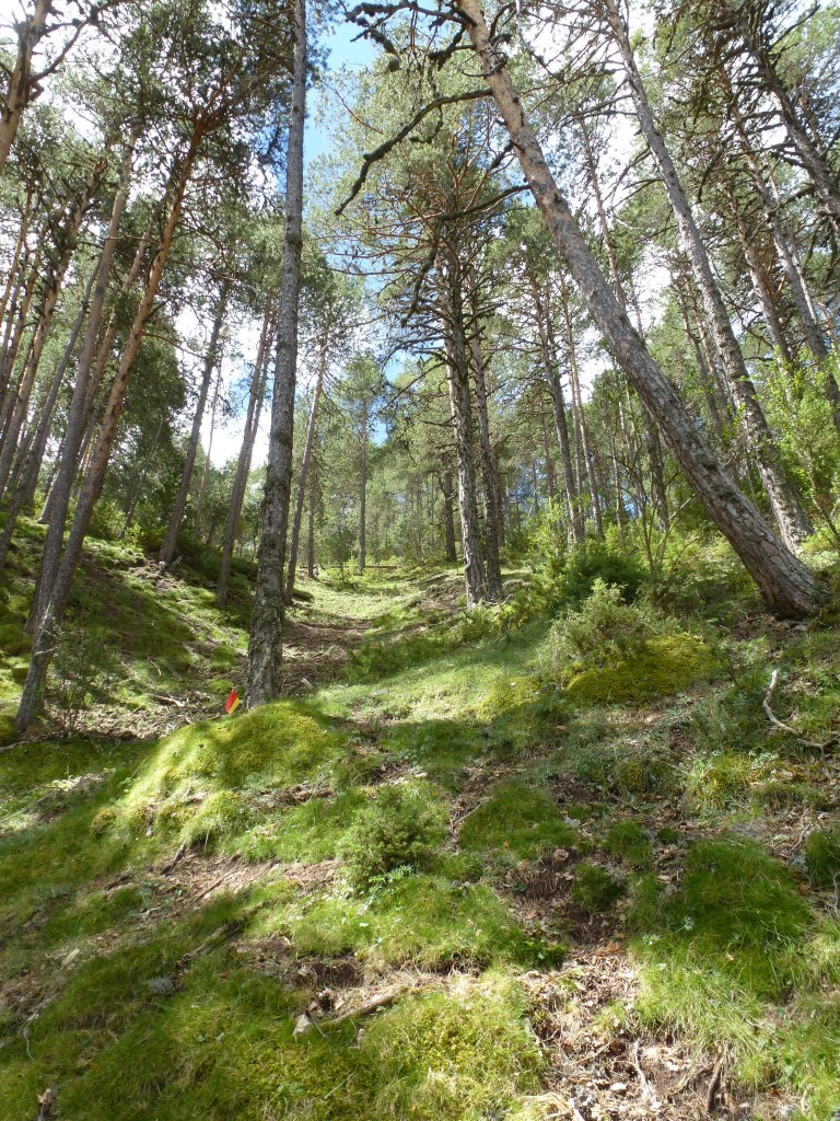 Remontaremos el arroyo, pasaremos por debajo de la carretera que va a Noguera y saldremos a una pista forestal que tomaremos. Ganaremos metros paralelos al barranco para acabar tomando otra preciosa sendita que conecta con la pista que va al Cerro de la Laguna.