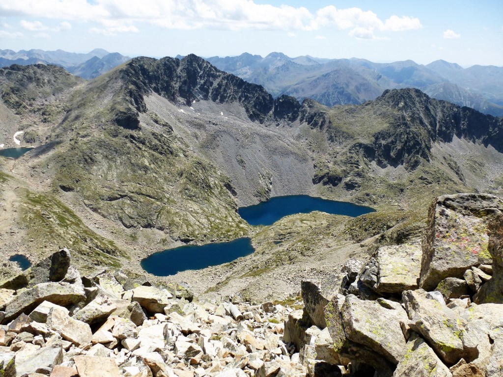 Una vez en el corredor correcto las cosas son más sencillas. Superaremos los últimos 40 metros de desnivel entre grandes bloques, echando la mano en alguna ocasión. De esta forma hacemos, por fin, cima (3014 metros). Aquí arriba, varios hitos y un vértice geodésisco que ha sido derribado y se encuentra unos 10 metros más abajo en la vertiente de los Estanys de Comalesbienes. También alguna placa conmemorativa.