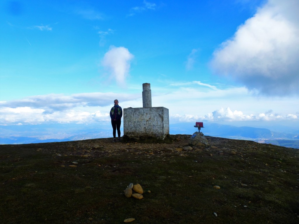 Desde la ermita a la cima apenas hay 10 minutos de senda. Discurre por el lomo de la montaña sin ninguna dificultad. Hacemos estos últimos metros disfrutando de las vistas, aunque la nubosidad impide ver el Pirineo en todo su esplendor.
