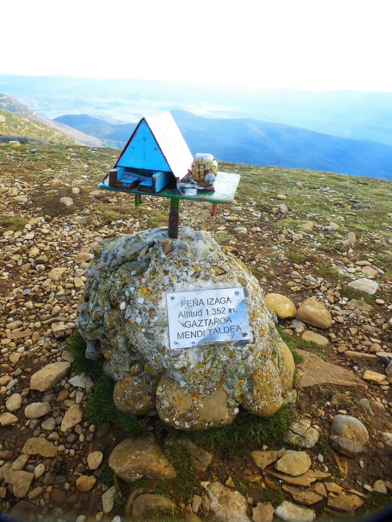 Casi sin darnos cuenta nos plantamos en la cima de Peña Izaga. Un gran vértice geodésico y un buzón tradicional con forma de casita adornan la amplia cima de la montaña, cubierta por una alfombra de hierba verde.