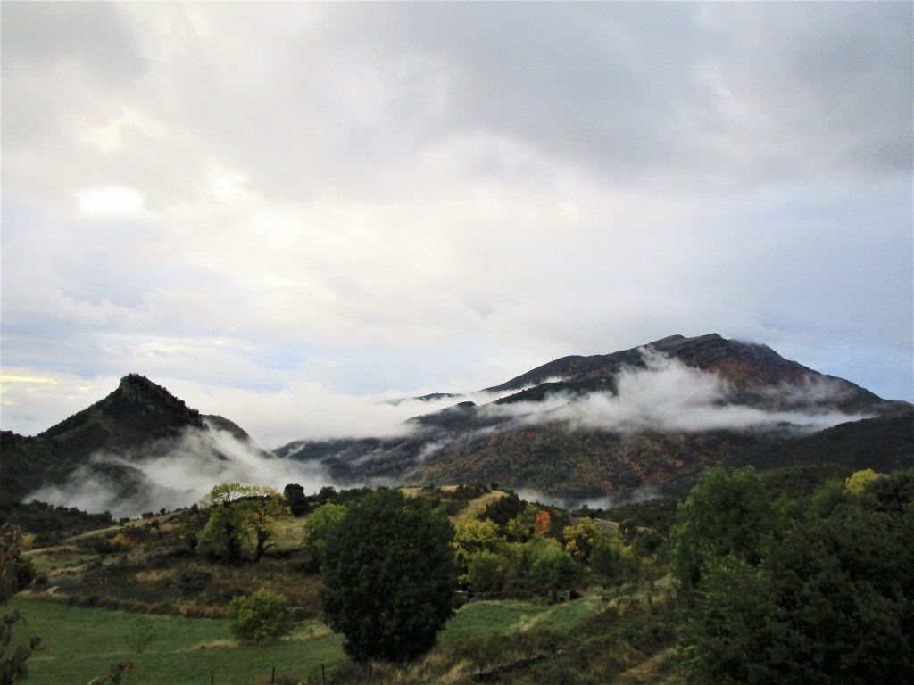 La senda comienza a subir decidida, atravesando un bosque mediterráneo muy bonito. Hasta la cota 1.100, iremos ascendiendo por un pequeño valle colgado sin ningún tipo de referencia. Alcanzada esta cota, llegamos a un falso collado y las vistas se abren. Vemos los coloridos hayedos de la Sierra de Galardón y la hermosa Peña Canciás (1.929 m), otra de las sierras exteriores de esta zona, de morfología muy similar al Nabaín.