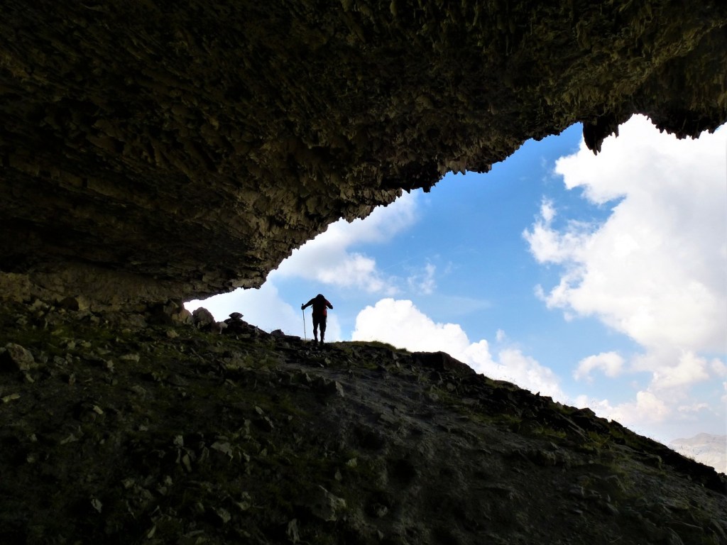 Ahora debemos descender unos pocos metros por terreno algo abrupto que nos obligará a echar la mano en alguna ocasión. Hay bastantes hitos e incluso unas marcas circulares de pintura blanca que ayudan a orientarse.