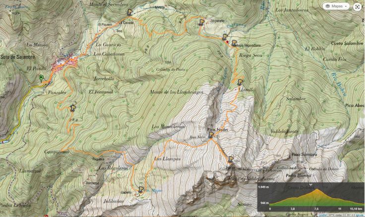 La ruta parte del pueblo de Soto de Sajambre. El ascenso se realiza por la cara norte de la montaña, visitando el refugio de Vegabaño y alcanzando el espectacular collado de Boa Neón. Para bajar, usaremos la menos transitada cara oeste conocida como las Llampas. Una ruta circular muy completa y variada con un sabor a alta montaña muy marcado.