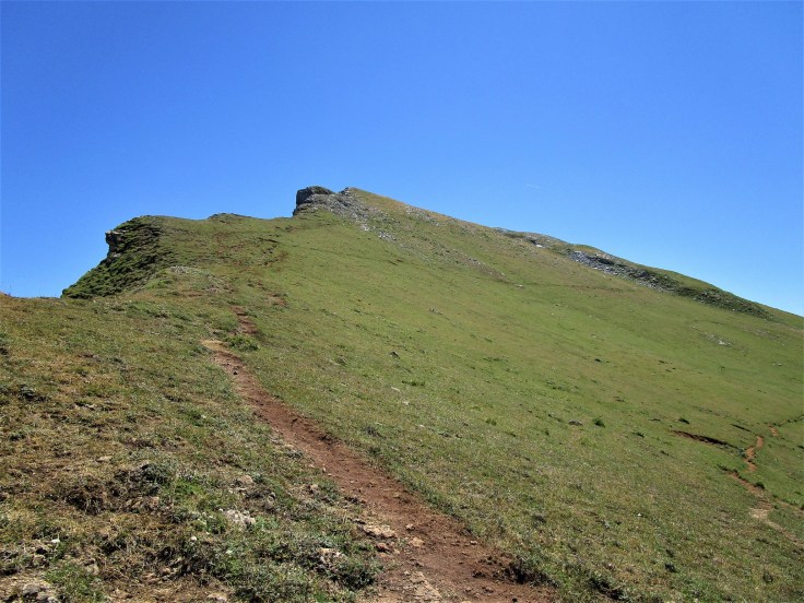 Si miramos a nuestra izquierda, veremos la pala de hierba que nos conducirá a la cima del pico Jario. Es empinada pero un camino bien hollado nos permitirá subir de forma cómoda.