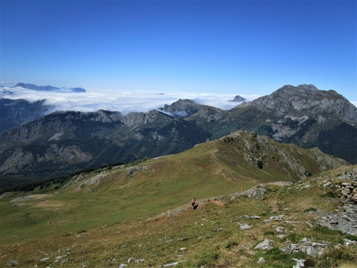 Al sur, destaca una antecima cercana del Jario y, detrás, un mar de picos leoneses, en la zona de Riaño.