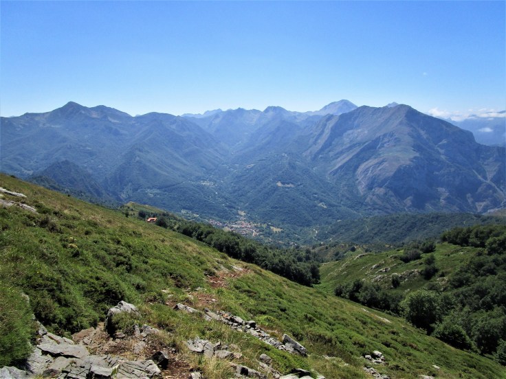 Conectamos con la pista que sube al refugio. El desnivel a superar se hace mucho más llevadero y pronto alcanzaremos una zona llana de praderas. Las vistas se abren hacia el NorEste donde la muralla rocosa del macizo del Cornión destaca sobre todo lo demás.