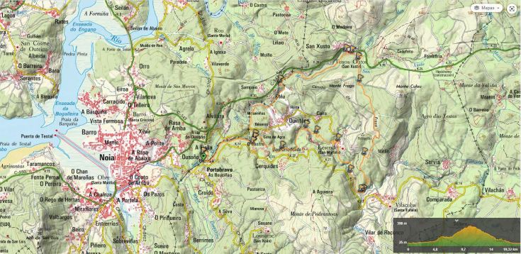 La ruta parte de la localidad de Portobravo, que pertenece al concejo de Lousame aunque está pegada a Noia. Siempre por senda, remontaremos el río Vilacoba, pasaremos por la aldea de Lesende y subiremos por las laderas del monte Culou (511 m) para pasar al valle colindante del río San Xusto. Tras pasar por su hermoso monasterio, descenderemos por el valle hasta conectar con el punto de partida.