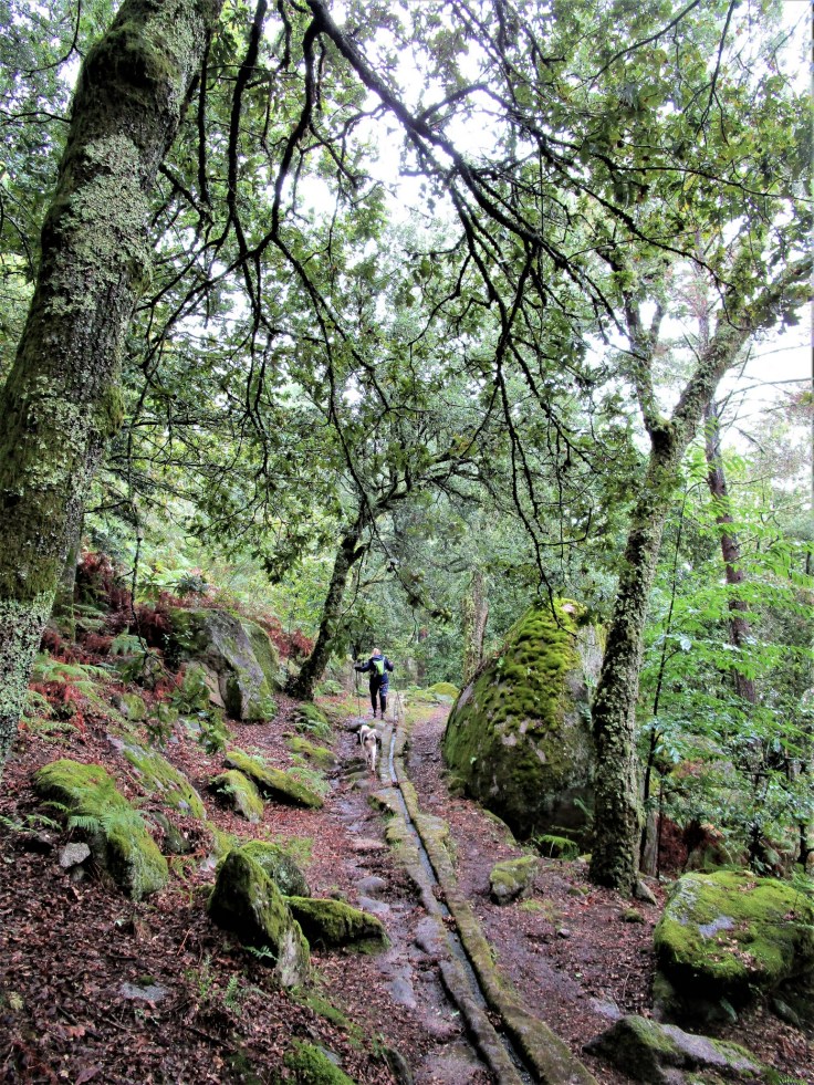La senda tiene un comienzo espectacular. Se interna en un frondoso bosque donde el verde lo inunda todo. Es una pena que el día no acompañe y la lluvia no dé tregua… pero así es el tiempo en Galicia aunque estemos en agosto.