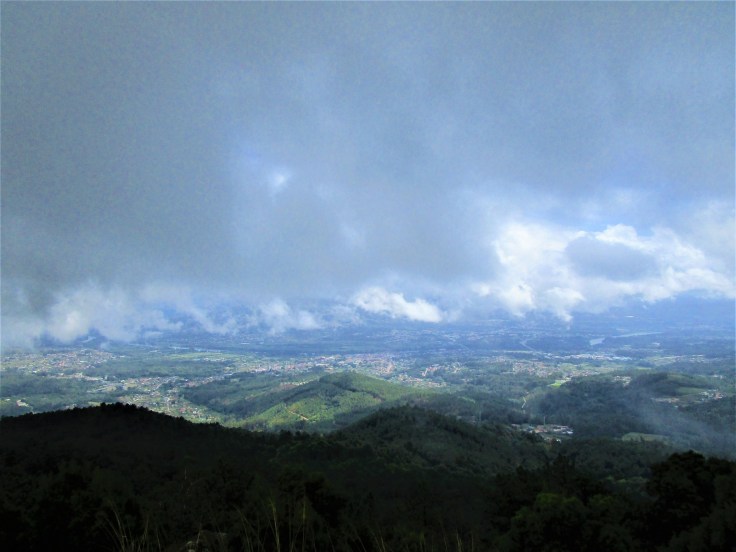 Aprovechamos para comer algo y, afortunadamente, la niebla da un poco de tregua y nos deja ver por unos minutos el paisaje que tenemos bajo nuestros pies. Alcanzamos a ver Tui y el último tramo del río Miño por unos segundos para volver a quedar pronto metidos en la niebla… una pena.