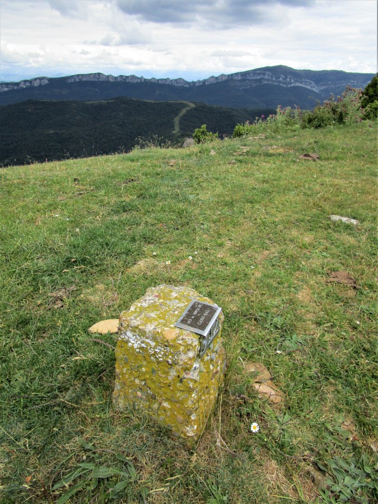 En el punto más alto hay un pequeño mojón con una plaquita que así lo indica. Desde la misma cima, veremos al pico Santo Domingo (1.523 m), principal montaña de esta zona del prepirineo y toda la cresta del Mal Paso por donde descenderemos en unos minutos.