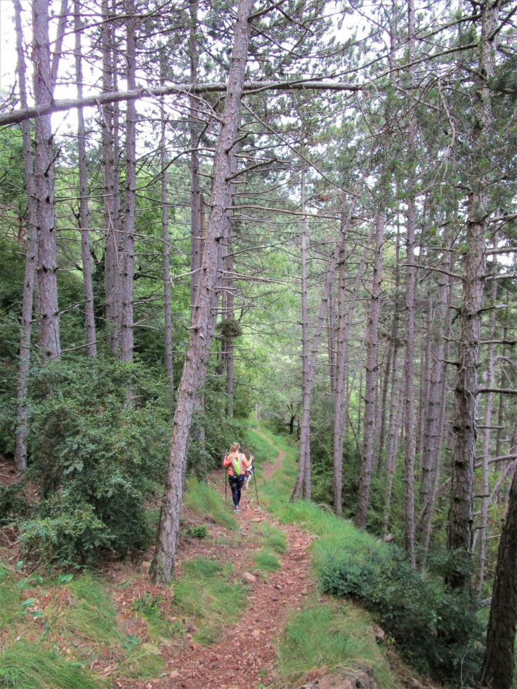 Pronto llegaremos a otro importante cruce de caminos, el collado de Erica la Fosa por donde pasa el GR-1 que vimos en Biel al inicio de la ruta. Tomaremos el desvío de la derecha, que vuelve a Biel por los barrancos de Embite y de la Carbonera. Es otra senda en perfectas condiciones que atraviesa un pinar muy bien conservado y fresco.