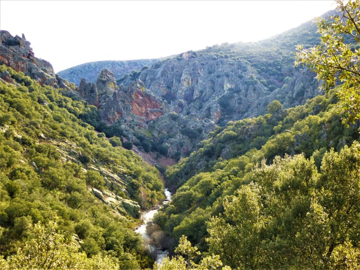 La pista conecta con la carretera que viene del pequeño pueblo de Corralejo y la sigue unos metros hasta que las balizas nos vuelven a sacar de nuevo a otro camino. Tras llanear durante un rato por una zona con abundante brezo, la senda se asoma al Cañón del Jaramilla (afluente del Jarama) y comienza un vertiginoso descenso.