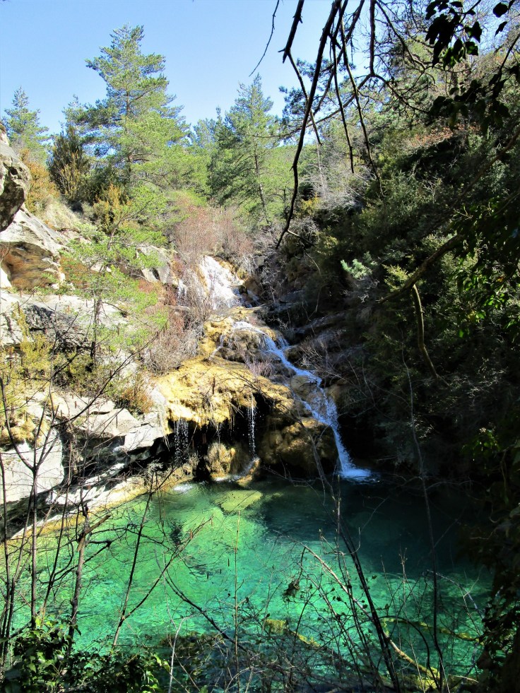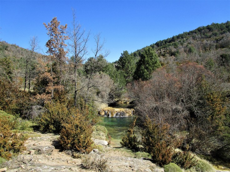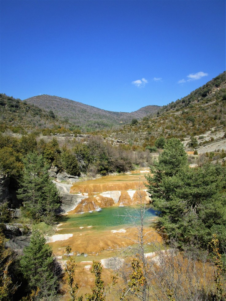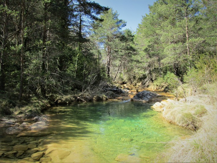 Comenzamos la ruta y enseguida tendremos un par de vadeos sobre el río Flumen. Han colocado unas piedras enormes que permiten cruzar el río sin mojarse los pies.