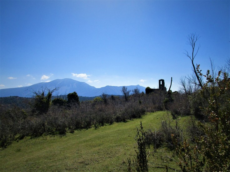 Alcanzamos por fin el pueblo de Ibirque. La iglesia nos da la bienvenida. Está parcialmente en ruinas pero sobrevive parte de la estructura y un lado de la torre. Las casas están todavía en peor estado, devoradas por la vegetación. Si seguimos unos metros más al Norte, dirección Gésera, podemos obtener unas bonitas vistas de los restos del pueblo con el Tozal de Guara de fondo.