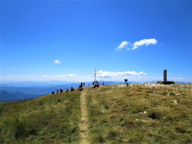 Alcanzaremos el cordal de la montaña y, ya por el «lomo», acabaremos haciendo cima. Se nota que es una cumbre muy popular, hay muchas familias y, en general, mucho movimiento en la cima. Una gran cruz blanca destaca sobre el resto de elementos como el buzón cimero o el vértice.