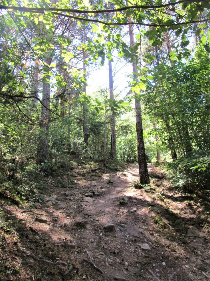 La parte más inclinada concluye y nos vamos metiendo en el bosque, primero por senda y después por una pista forestal. Estamos en la cota 1400, es decir, hemos perdido 600 metros de desnivel en un momento…