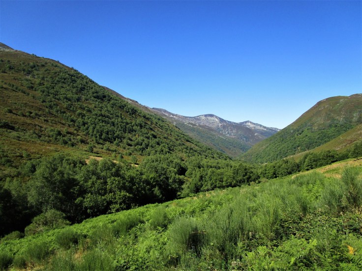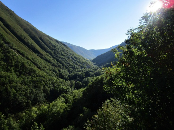 La pista llanea durante bastante tiempo y se avanza con rapidez. Hay tramos donde caminaremos bajo el bosque y otros más abiertos donde el sol pega con fuerza. Son días de ola de calor y he tenido que madrugar para no pasarlo mal. Son las 9:30 horas de la mañana y la brisa todavía viene fresca.