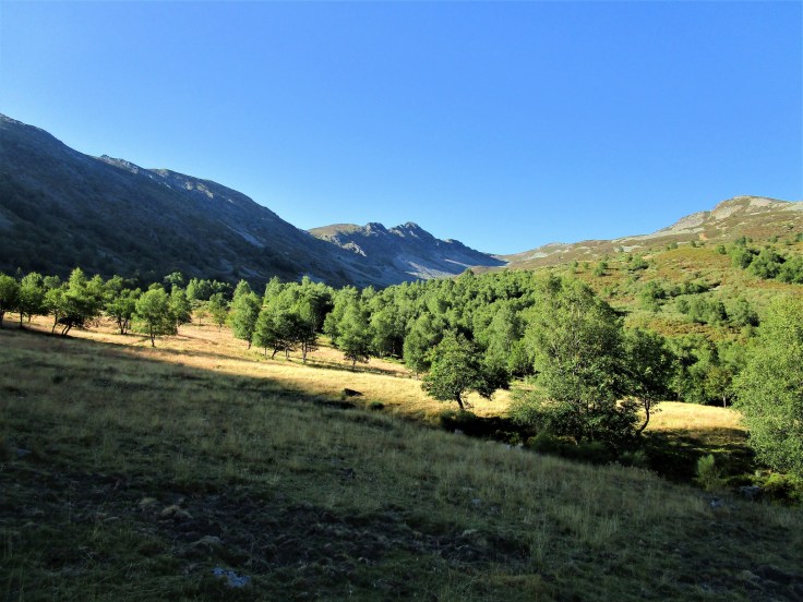 Alcanzamos el fondo del valle y comenzaremos a girar 90º a la derecha. A mano izquierda, tendremos toda la muralla rocosa formada por el Pico de la Cernella (2.117 m) y el Catoute. Enfrente, todavía muy arriba, el collado (2.026 m) al que debemos llegar. En este punto, atravesaremos una zona de amplias praderas conocida como Campo la Veiga (1.535 m).