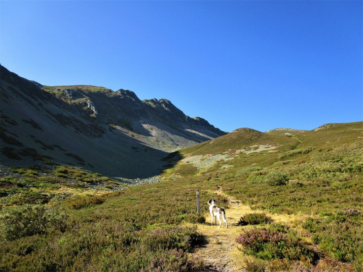 La subida al visible collado es dura, pues hay que ganar 500 metros de desnivel en apenas 2,5 kilómetros. Por contra, el sendero es muy cómodo. Iremos atravesando amplias laderas cubiertas por brezo sin ninguna dificultad. Poco antes de alcanzar el collado, pasaremos junto a una pértiga de medición de espesores de nieve. Un último empujón por fuerte pendiente y llegaremos al collado.
