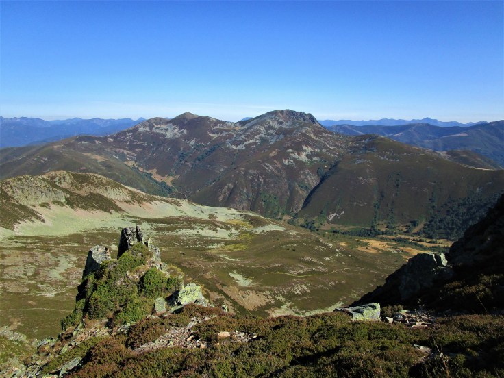 Estamos ya por encima de los 2.000 metros de altura. A nuestras espaldas, se levanta el cordal más alto de la sierra de Gistredo con la Peña de Valdeiglesias (2.134 m) destacando sobre el resto de picos que se levantan sobre el valle de Salentinos. A nuestra derecha, con su característica forma puntiaguda, sobresale la cima del Catoute. Estamos muy cerca de ella, de hecho, el vértice geodésico es bien visible desde este punto. Un buen camino remontará el hombro Sur de la montaña.