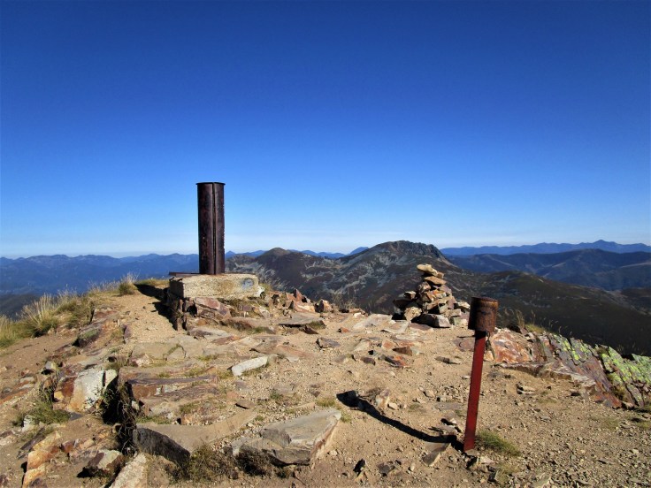 La subida final es empinada pero no entraña dificultades, al menos, sin nieve o hielo. Hacemos cima, en lo más alto, un viejo buzón, un hito y un vértice geodésico protegido por un extraño caparazón metálico. He visto muchos vértices pero ninguno con este «escudo».