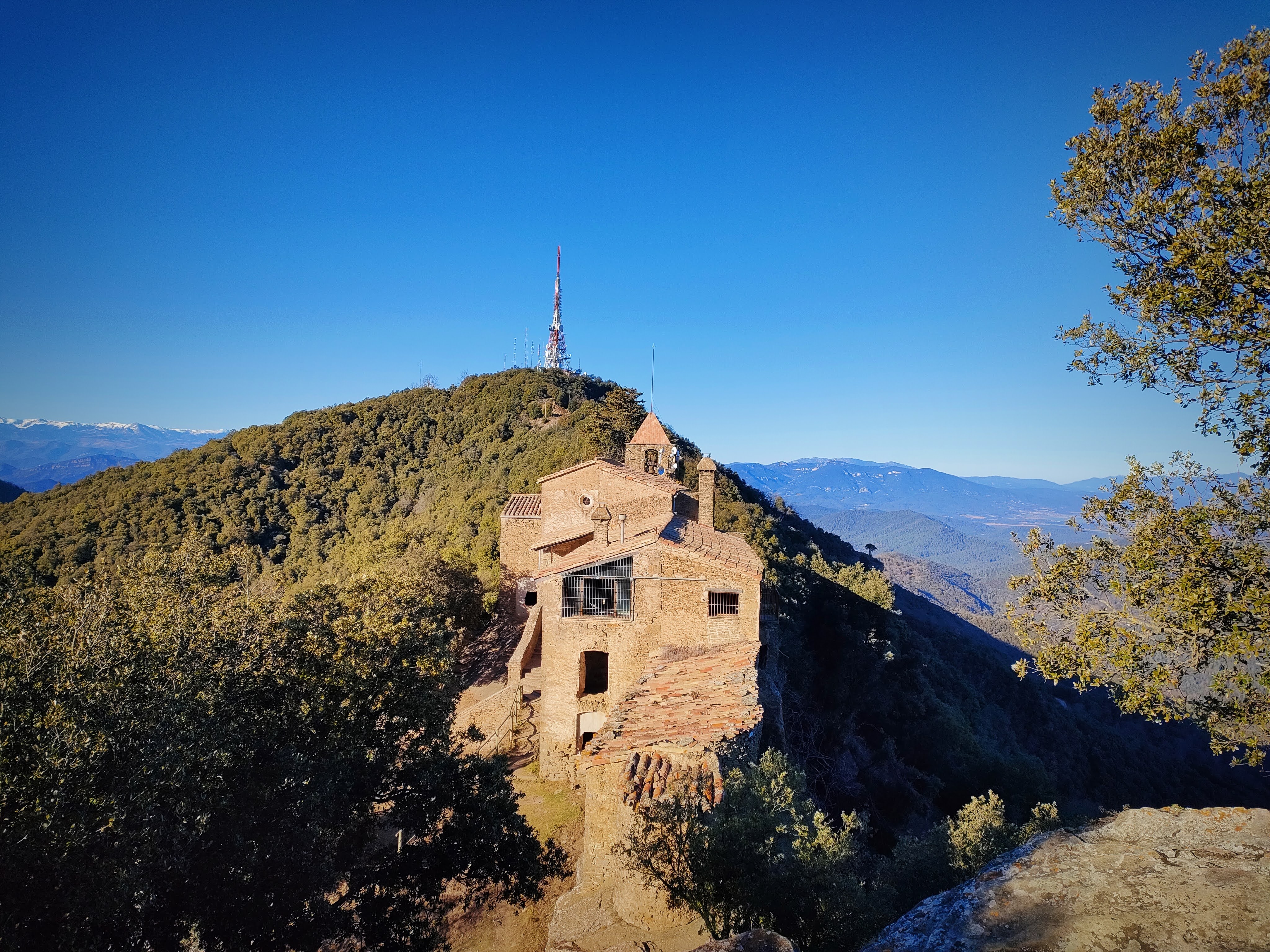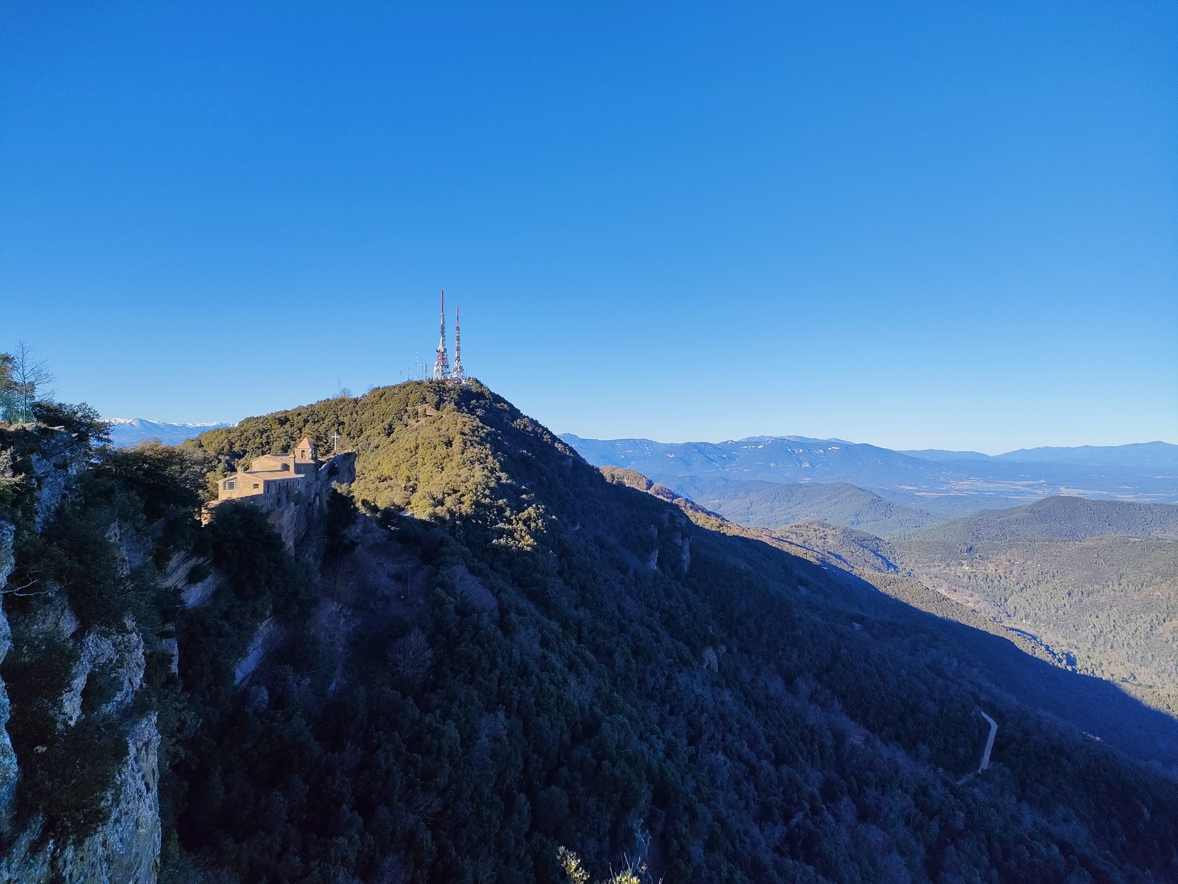 El cordal tiene algún subibaja bastante pronunciado. Poco a poco nos iremos acercando al santuario que aparece ante nosotros colgado de un escarpe, casi casi suspendido en el vacío. La vista es espectacular. Al fondo se aprecian los picos nevados del Pirineo, concretamente el Puigmal (2.910 m) y toda la cabecera del Alto Ter destacando también el Pic de Costabona (2.465 m). También se distinguen las montañas de la Alta Garrotxa.