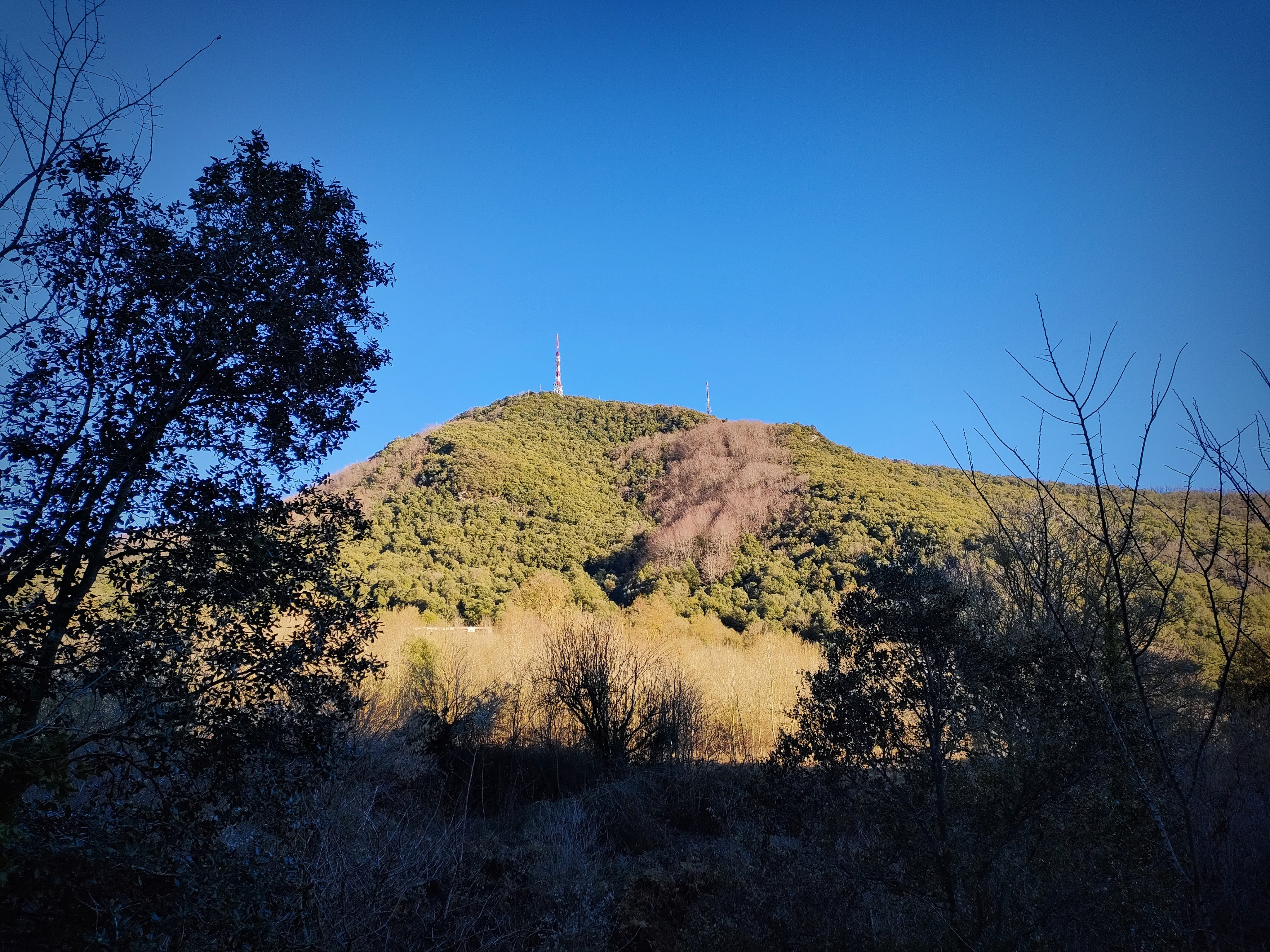 Alcanzamos el santuario, que tiene algunos desperfectos, y seguiremos bajando por unas escaleras hasta dar con una pista forestal que sube a las antenas de la cima del Rocacorba, también conocida como Puigsou (992 m). No tomaremos el desvío a la derecha que sube a la cima, en su lugar, giraremos a la izquierda por un sendero bien definido que se interna en el bosque.