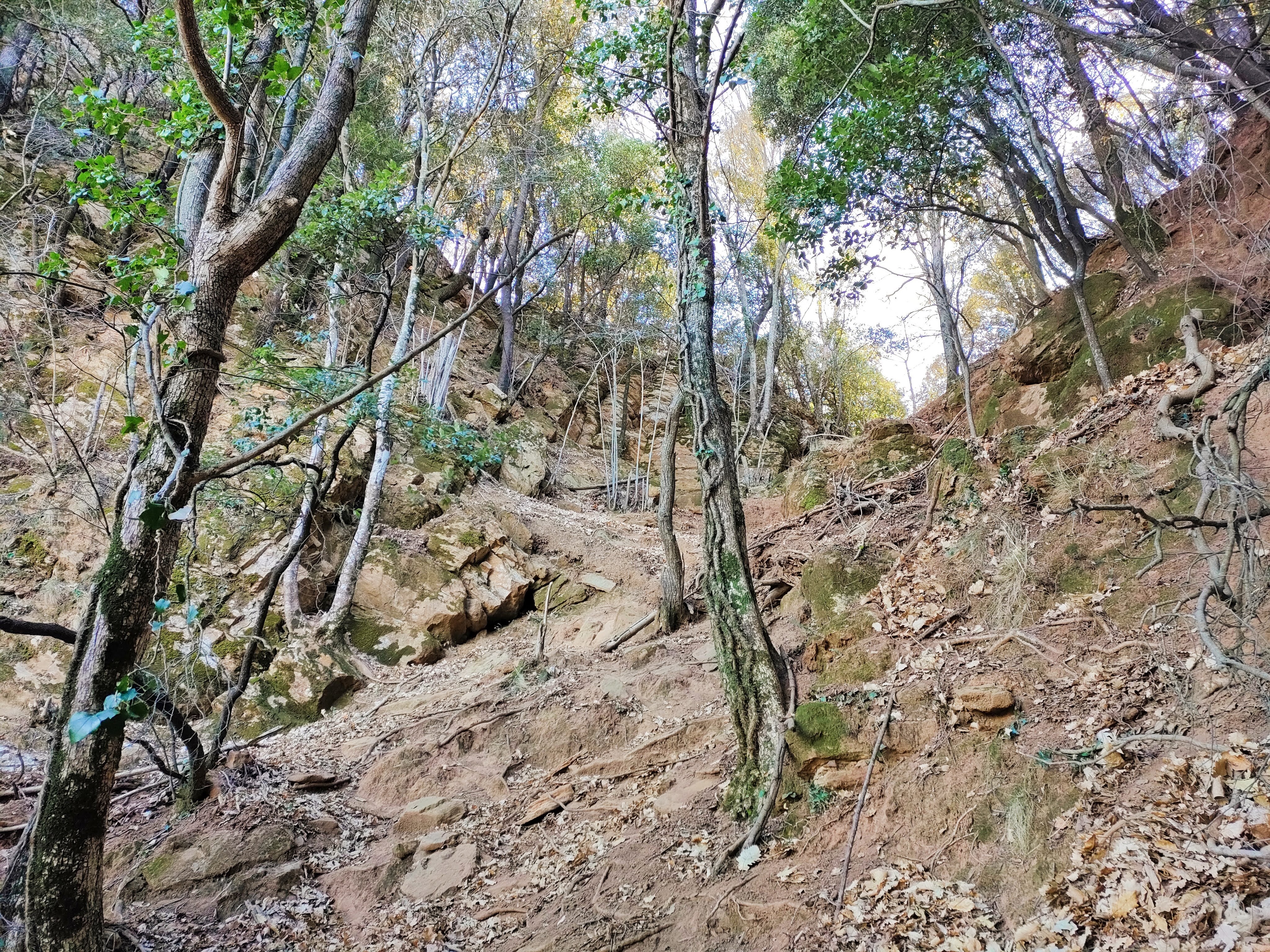 Este sendero baja hasta conectar con la Riera de Canet (conocida como Riera de Rocacorba en su tramo alto). El camino cruza varias veces una pista y es un poco confuso por la cantidad de hojas secas que hay en el suelo pero se sigue bien si estamos atentos.