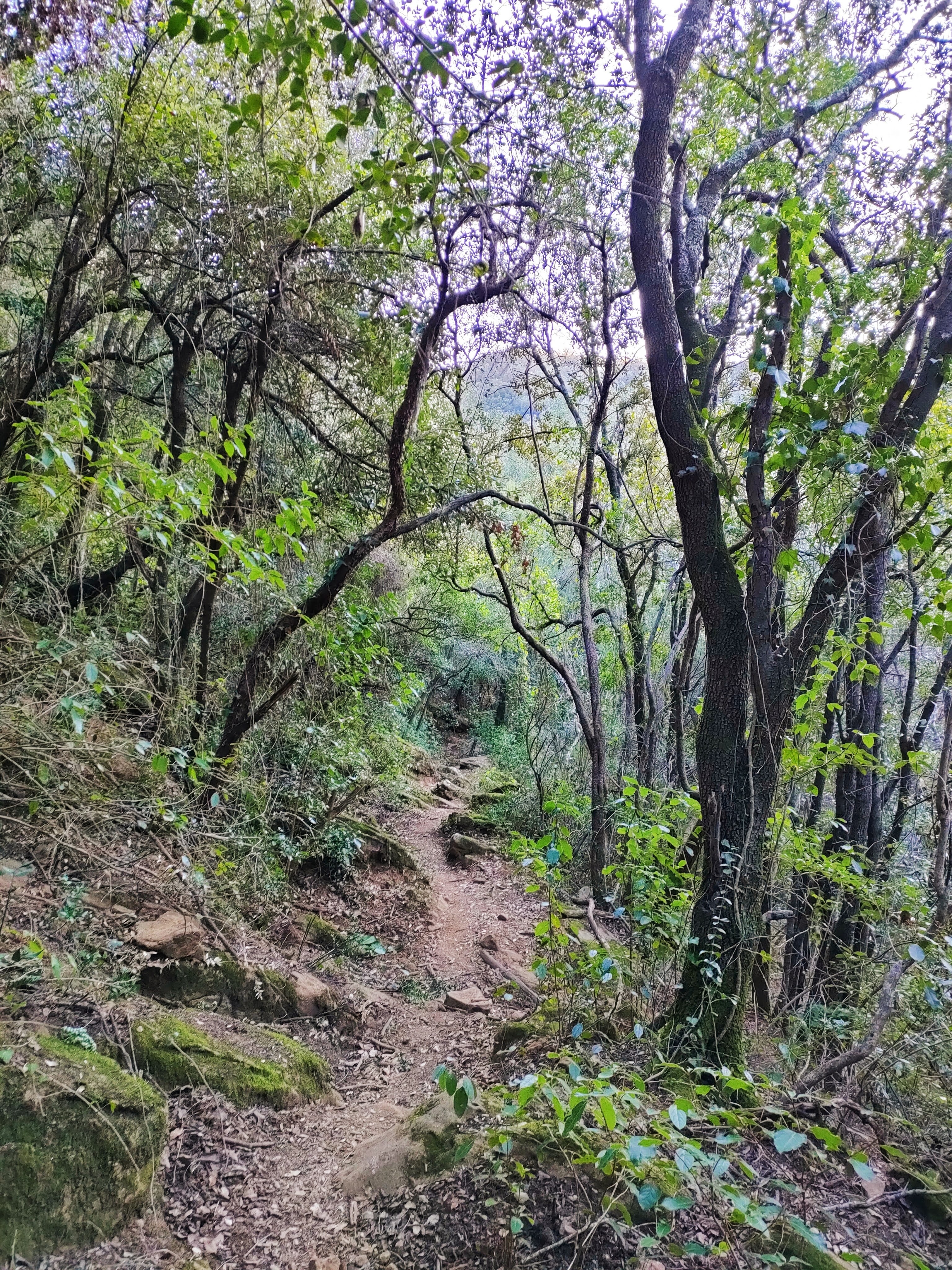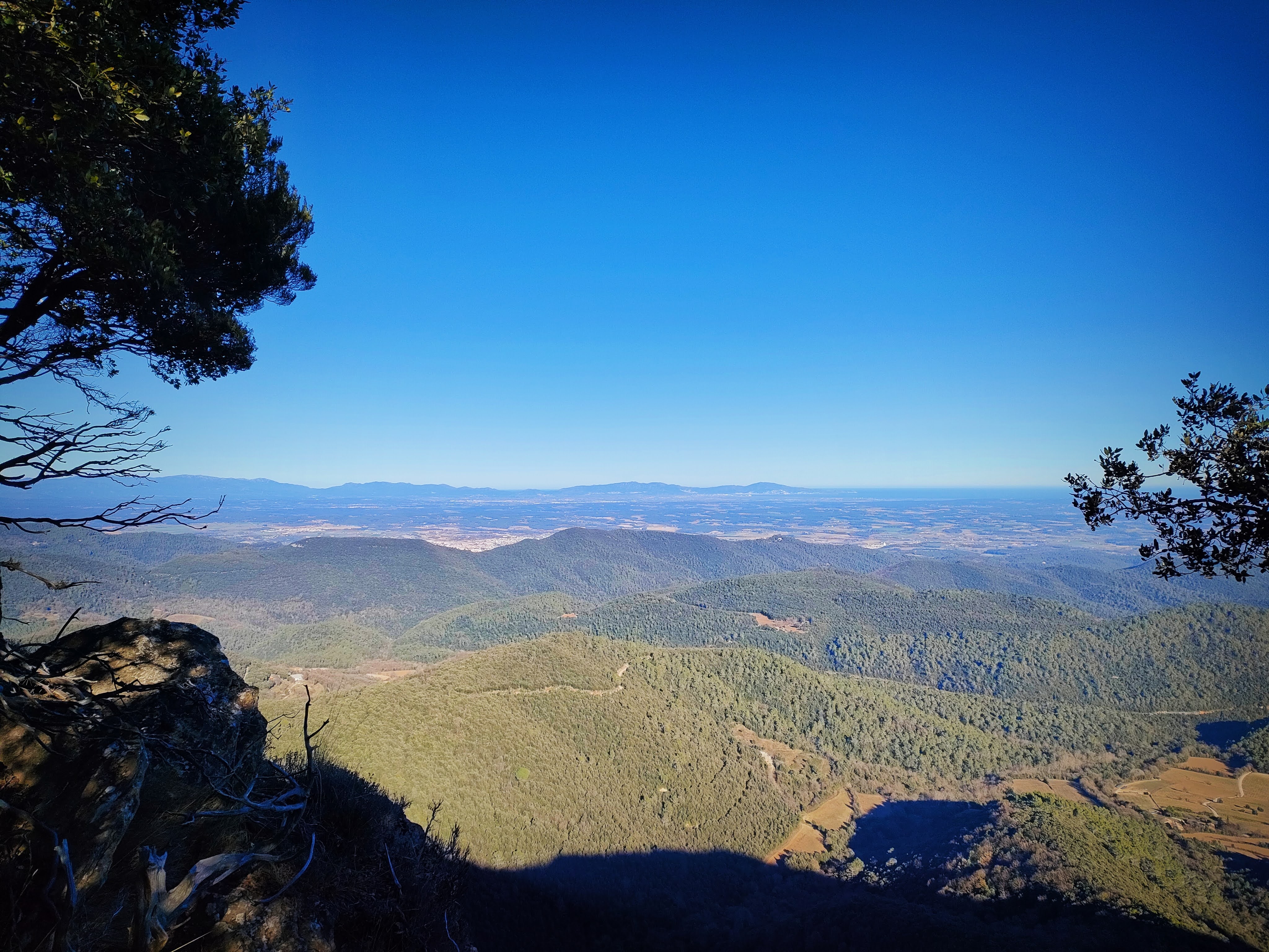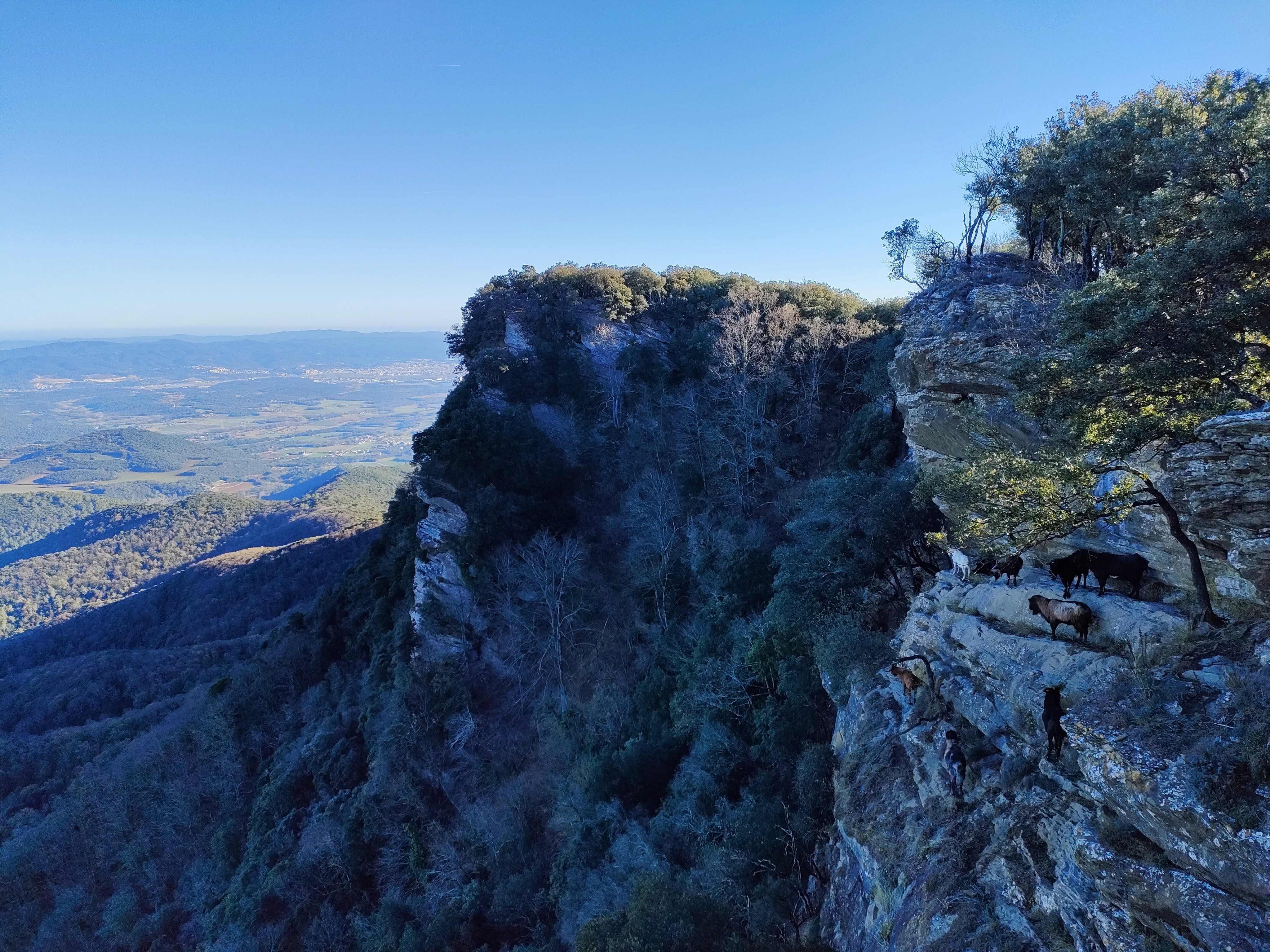 Ya en el cordal giraremos hacia la derecha, con dirección Norte, y caminaremos por un sendero bastante bien definido que atraviesa el bosque y, en ocasiones, se asoma a la vertiginosa cara Este de la montaña donde hay una buena caída y unas extraordinarias vistas. De hecho, se alcanza a ver el mar Mediterráneo y el Golfo de Rosas.
