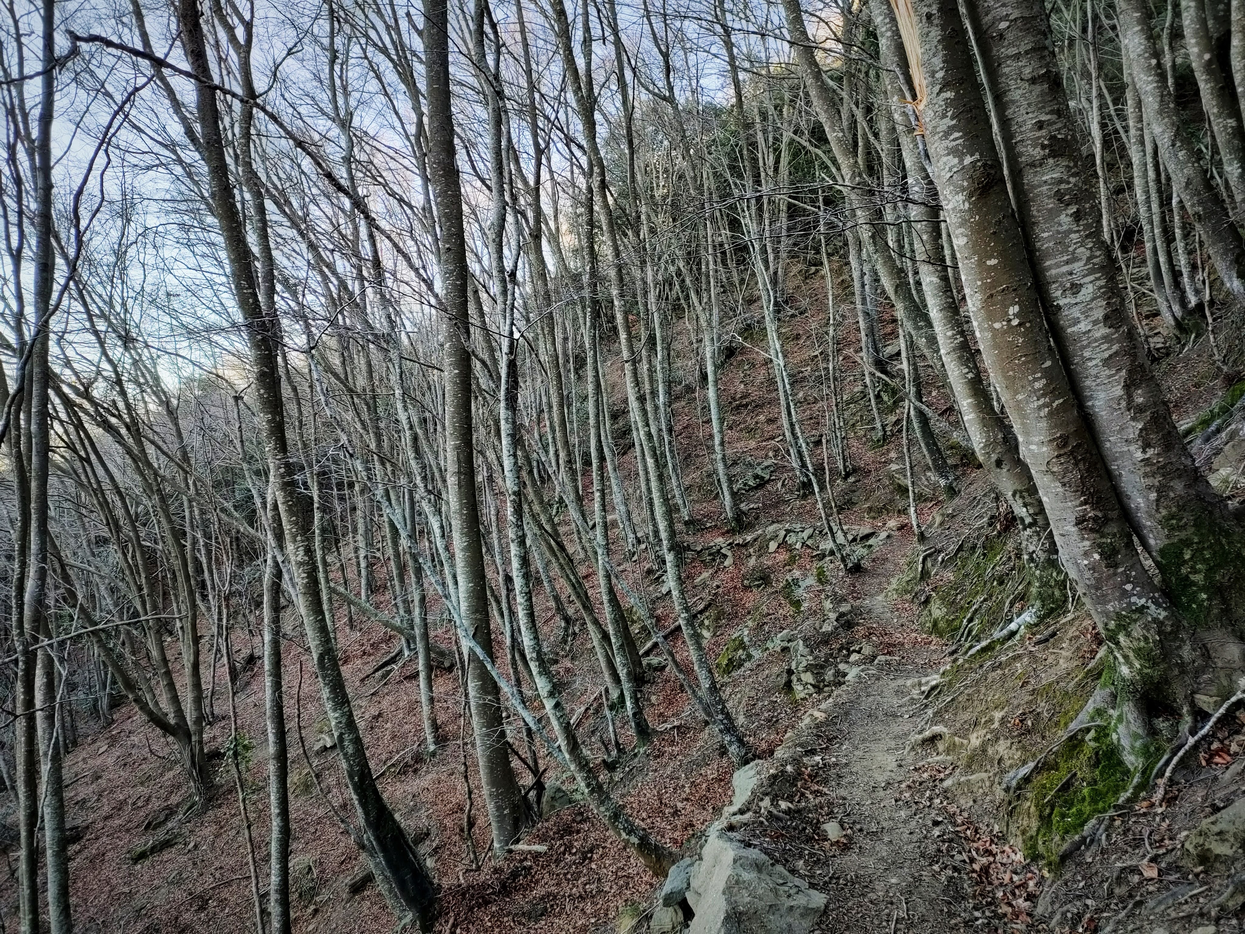 Alcanzaremos enseguida el pequeño hayedo que hay bajo la cima. En este punto, el sendero zigzaguea en un tramo bastante escarpado. Han colocado una especie de escalones con maderos que ayudan a bajar de manera más o menos cómoda el tramo más empinado.