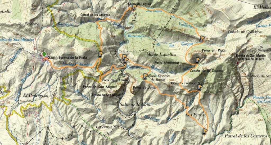 La ruta parte del encantador pueblo de Santa Eulalia de la Peña, también conocido como Santolarieta. Bien es cierto que podemos empezar también desde el parking del Salto de Roldán, cercano al pueblo, evitando así unos 4 kilómetros en total, pero me gusta más comenzar en pueblos y los kilómetros que hagamos de más serán por un sendero muy bonito así que me, personalmente, a mi me compensa.