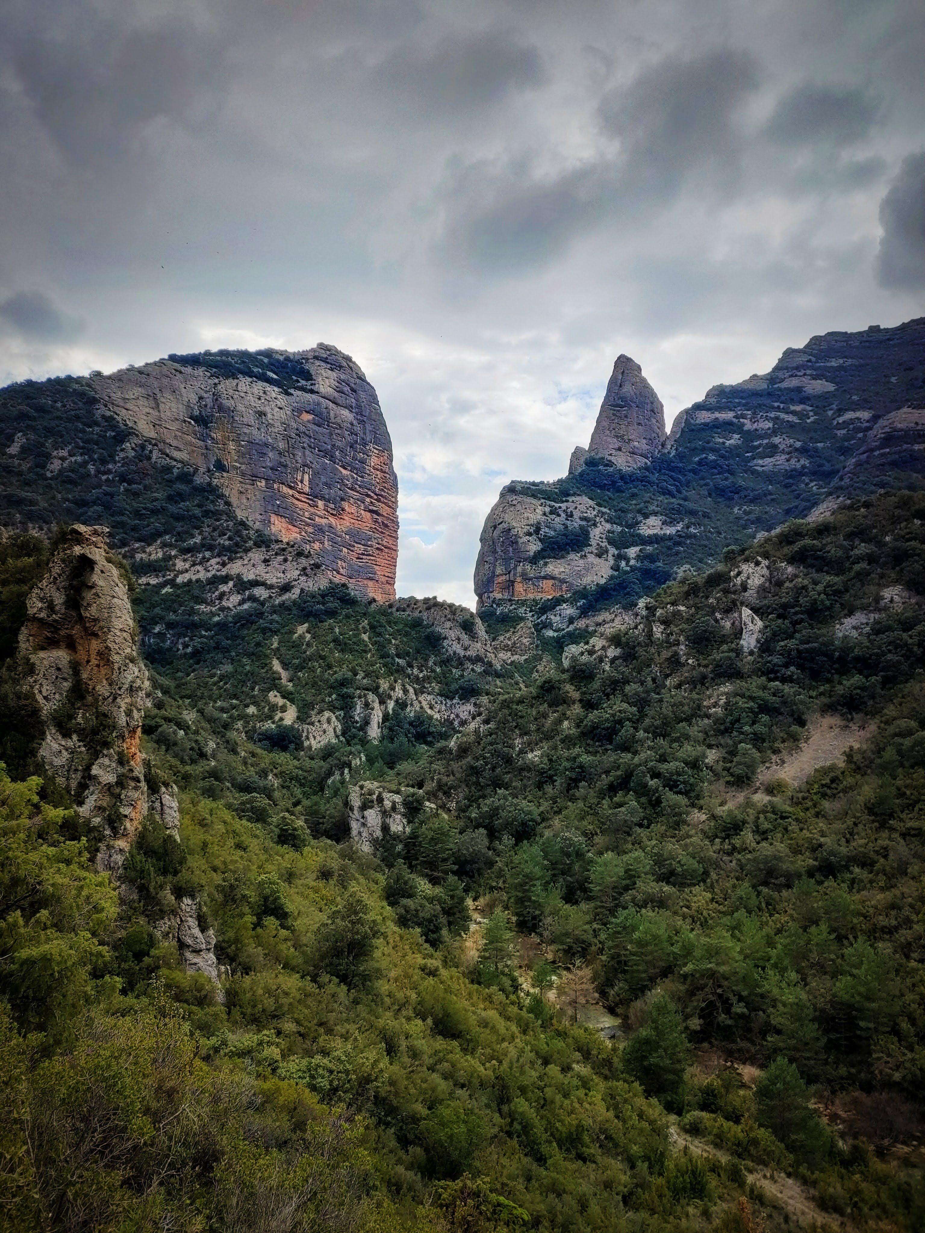 Las vistas de la «espalda» del Salto de Roldán son muy buenas. Perderemos unos 300 metros de desnivel por un bonito zig-zag hasta alcanzar el cauce del Flumen. Baja un buen caudal y no hay puente, solamente unas rocas y un tronco bastante precario, por lo que toca mojarse los pies. Imagino que en otras épocas más secas se podrá cruzar de manera más cómoda…