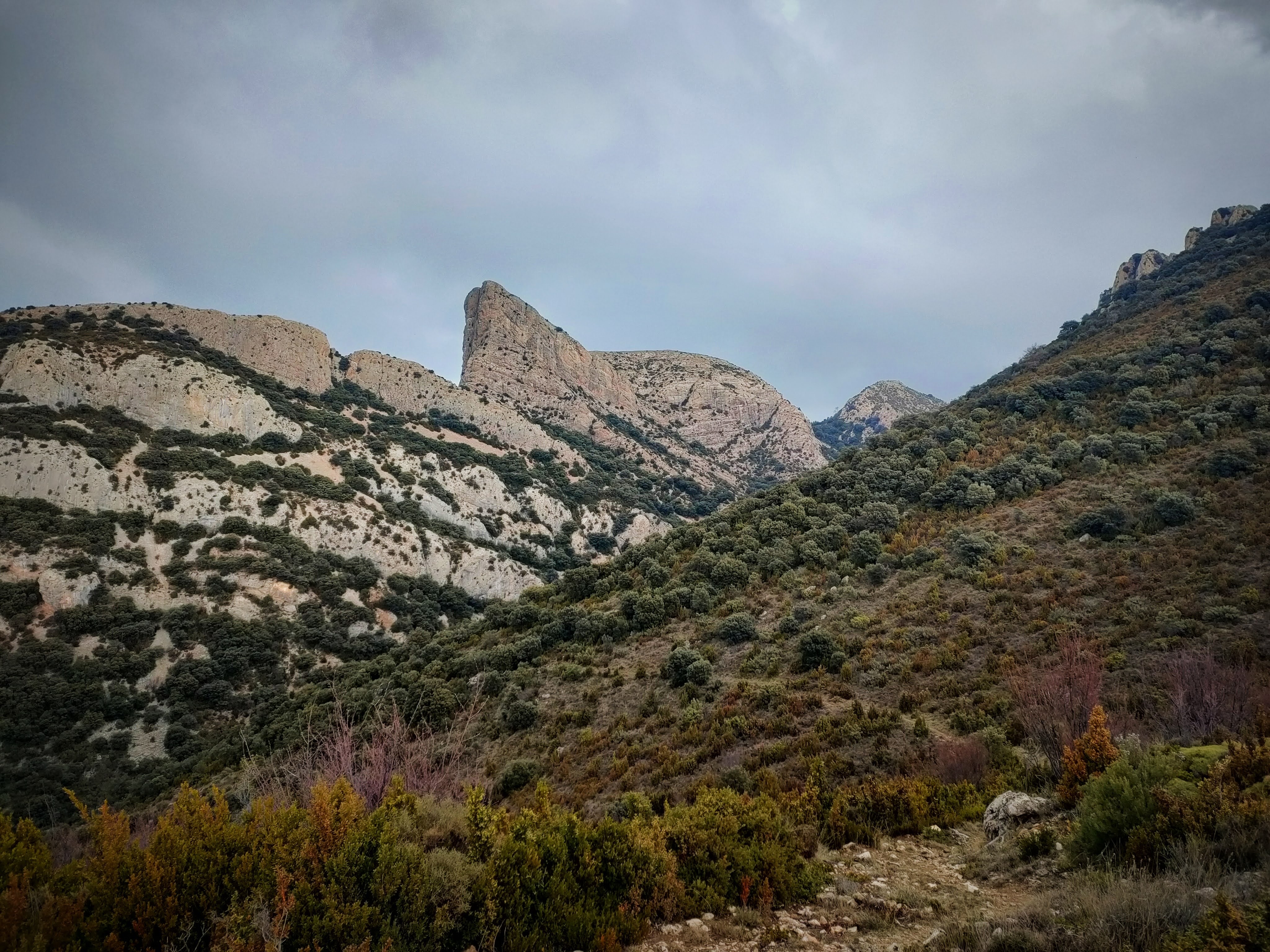 El sendero corona un segundo colladete y pasa bajo las paredes escarpadas del Picón para después descender hacia la espalda de esta montaña. Enfrente tendremos las Crestas de Valleclusa que tendremos que superar para tomar el barranco del mismo nombre por donde bajaremos de nuevo al río Flumen.