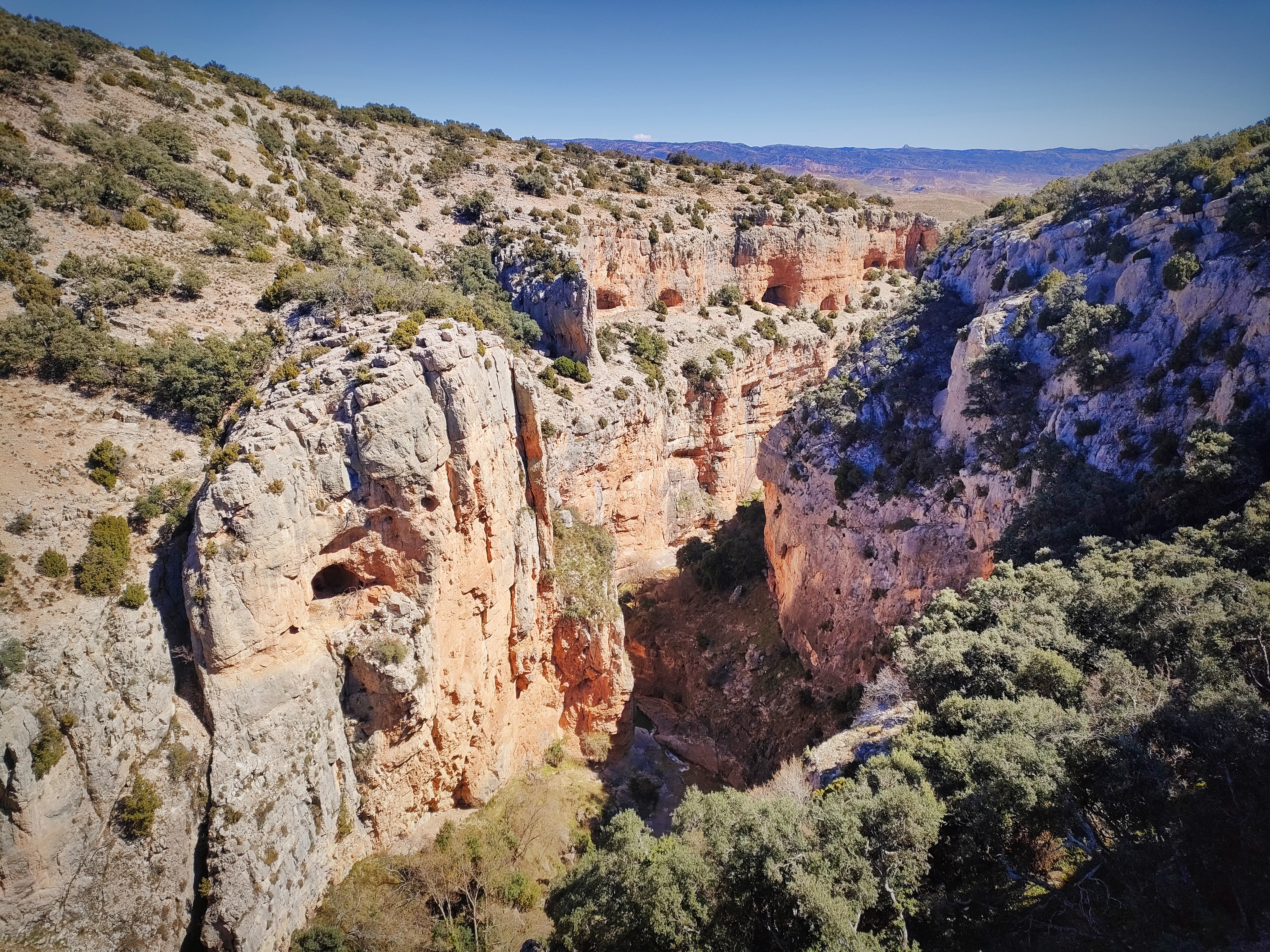 Tras la visita, tomamos una pista que se adentra poco a poco en el conocido como Hocino de la Rambla, un nuevo cañón formado por este pequeño río de la Rambla, uno de los primeros afluentes del río Martín. Este cañón es de mayor entidad que los pequeños hocinos que hemos visitado hace un rato.