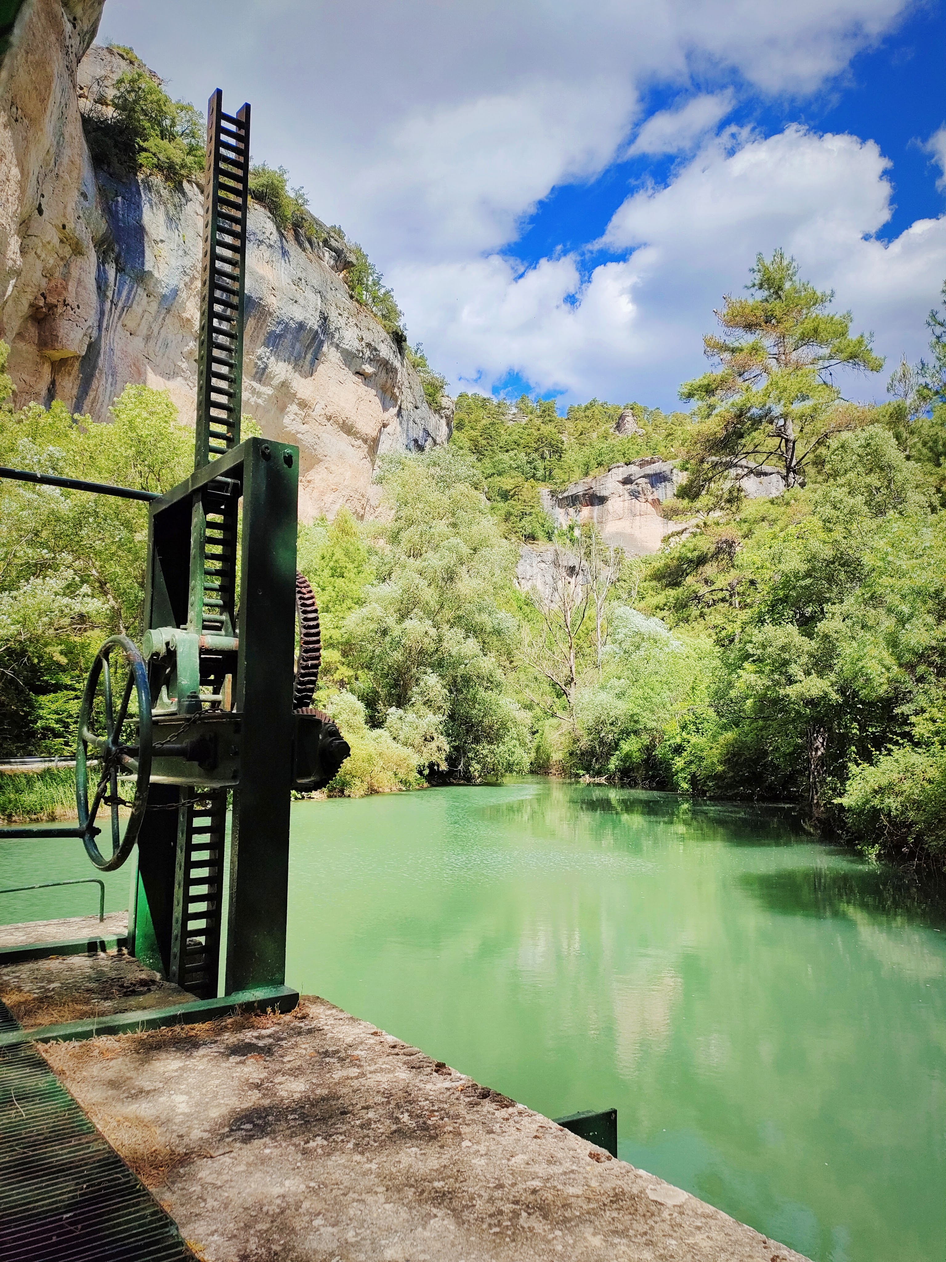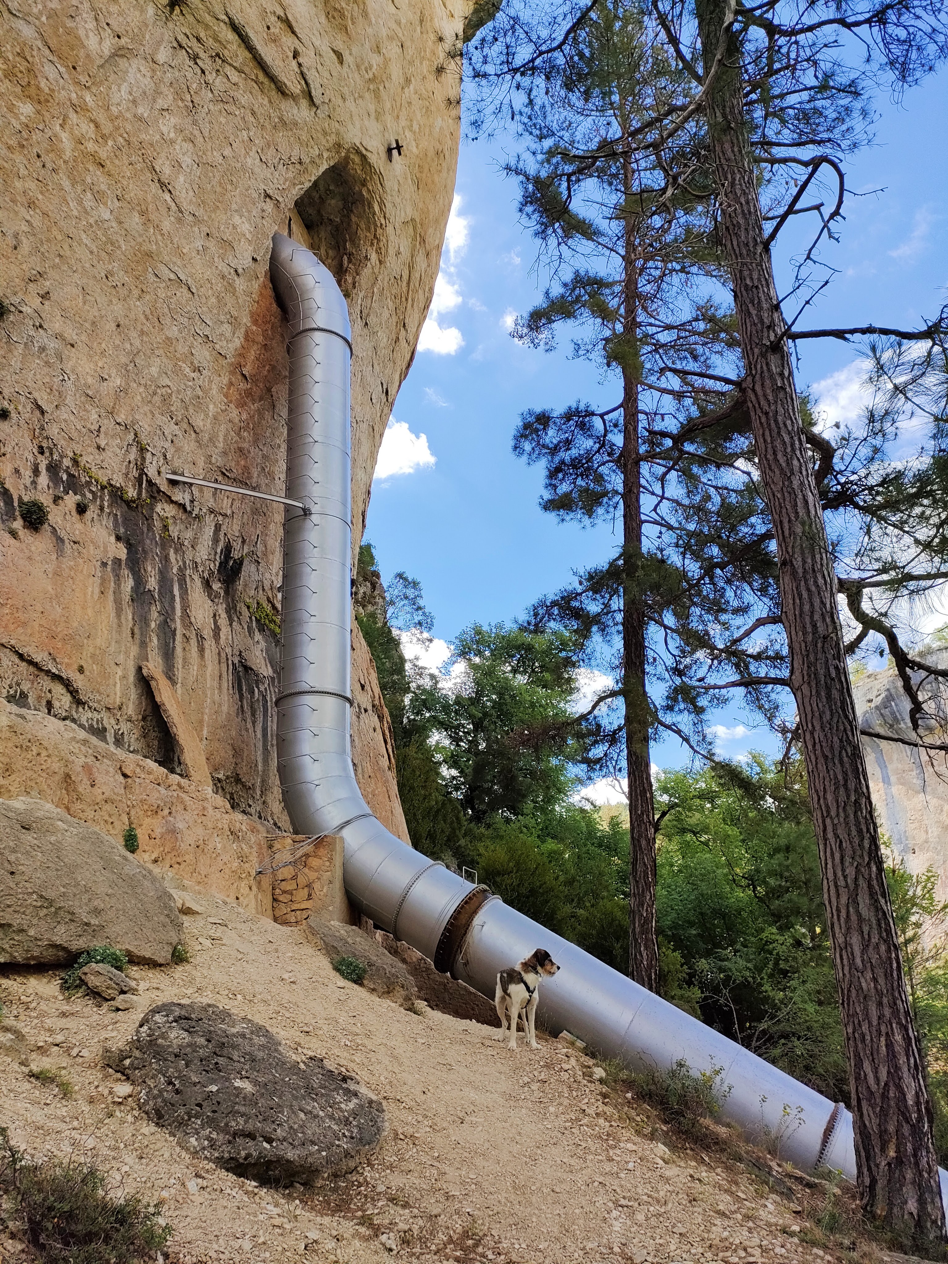 Pocos metros antes de alcanzar el área recreativa de los Tilos, donde hay un segundo aparcamiento, veremos una impresionante tubería metálica que sale de la pared de la hoz, conocida popularmente como «gusano de acero». Forma parte de las instalaciones de una pequeña central hidroeléctrica ubicada junto al área recreativa.