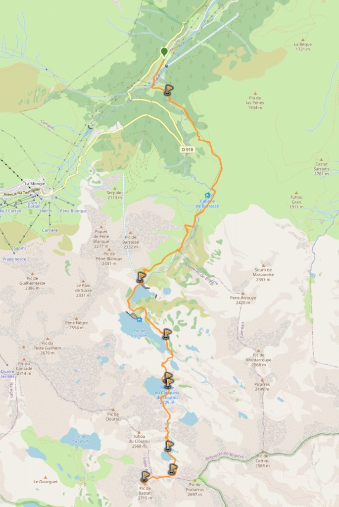 Al Pic de Bastan se suele acceder desde el Col de Portet (2.214 m) o desde el Lac de l’Oule (1.824 m) para ahorrar desnivel a través de los Lacs de Bastan, pero nosotros lo hicimos desde las faldas del Tourmalet, concretamente desde Artigues, un pequeño núcleo turístico situado a 1.200 metros de altura en el Vallée de Gripp. El resultado es una excursión larga y muy completa que combina valles verdes y bosques en cotas bajas con los lagos y la áspera roca de la alta montaña.