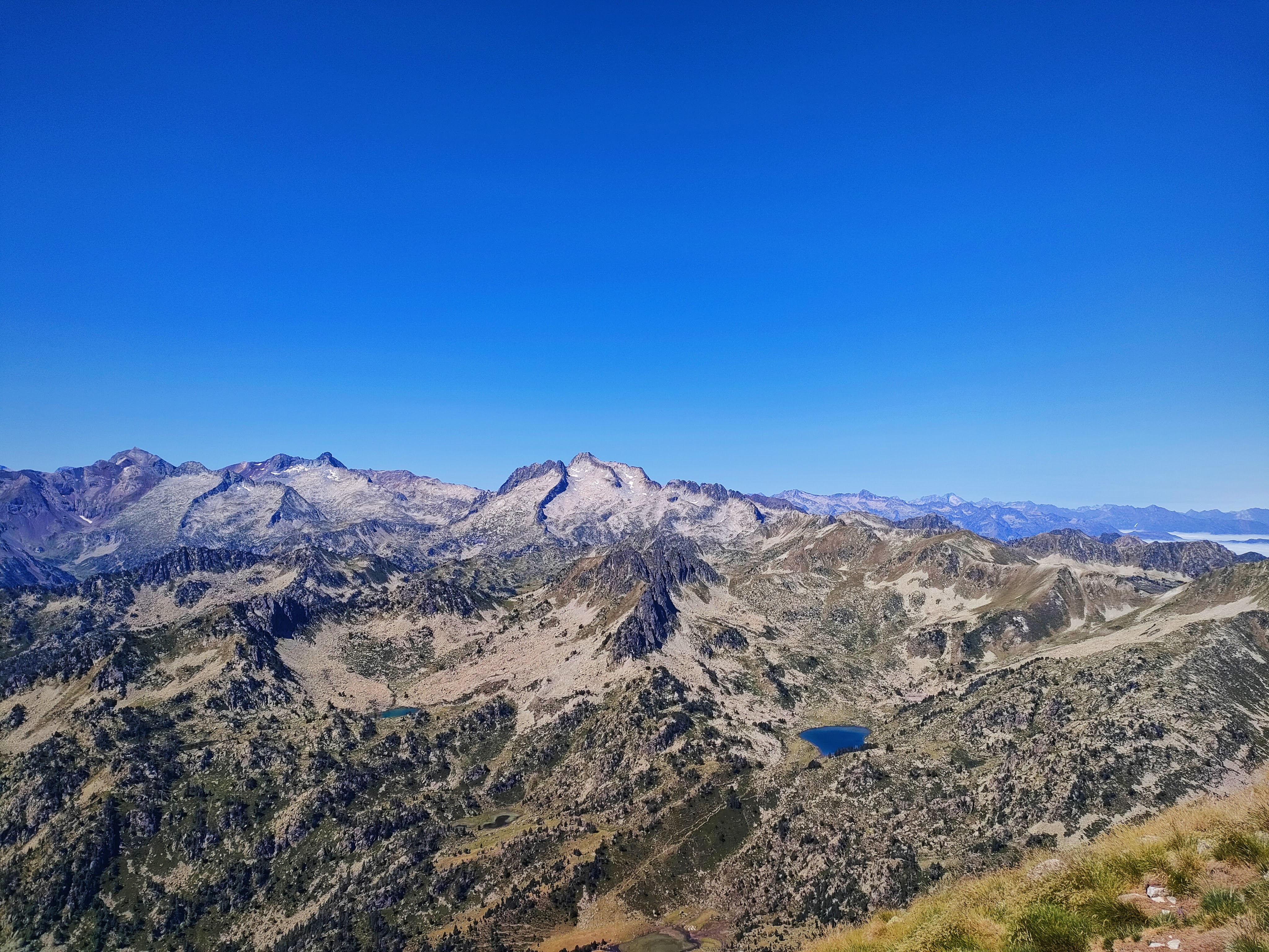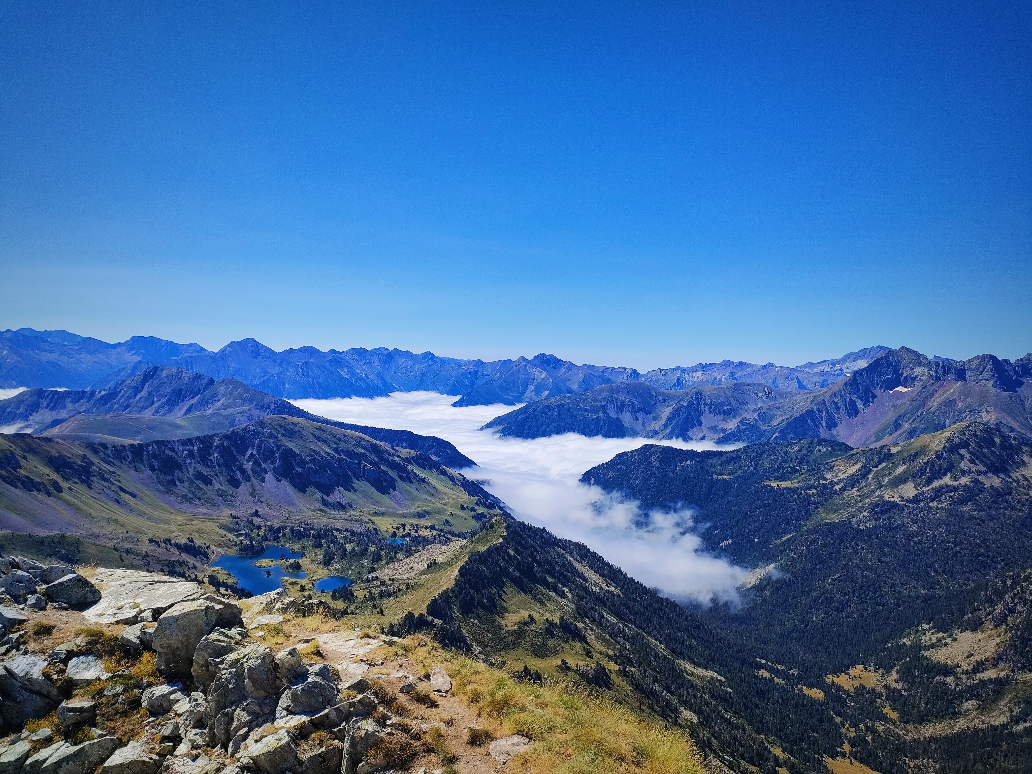 Ya en el collado las vistas se abren hacia el Sur, con los lagos de Bastan y los picos de la frontera franco-española. Destaca el gran Lac de l’Oule que hemos mencionado antes, muy popular entre los turistas franceses, cubierto por un mar de nubes.