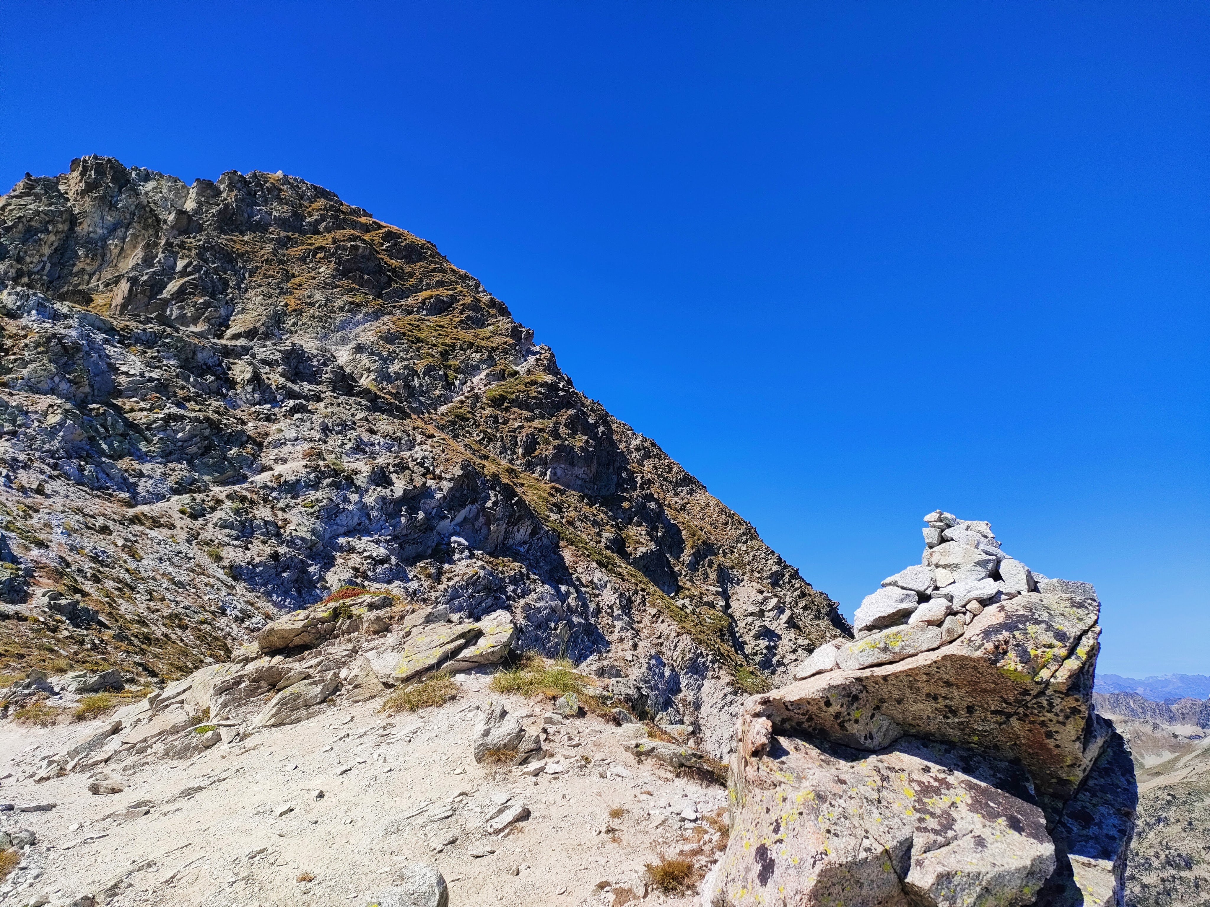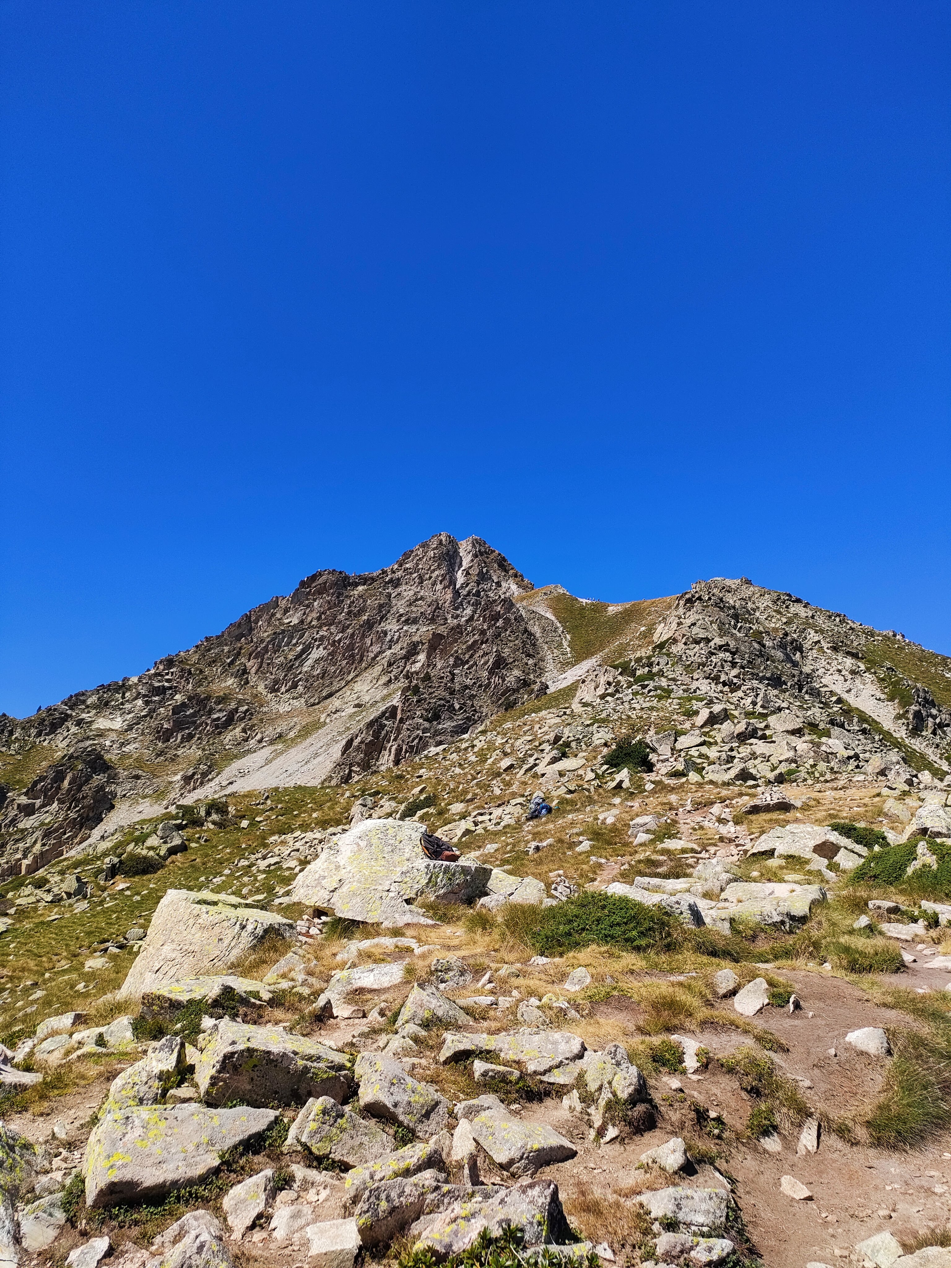 Toca ahora abordar la ascensión al Pic de Bastan desde el collado. El camino sorprende por lo marcado que está, casi más marcado que el propio GR-10 que veníamos siguiendo. Primero ganaremos un hombro bien visible desde el collado por la cara Sur del pico para después alcanzar un pasaje un tanto expuesto en la cara Norte pero que no tiene dificultades en seco y sin nieve.