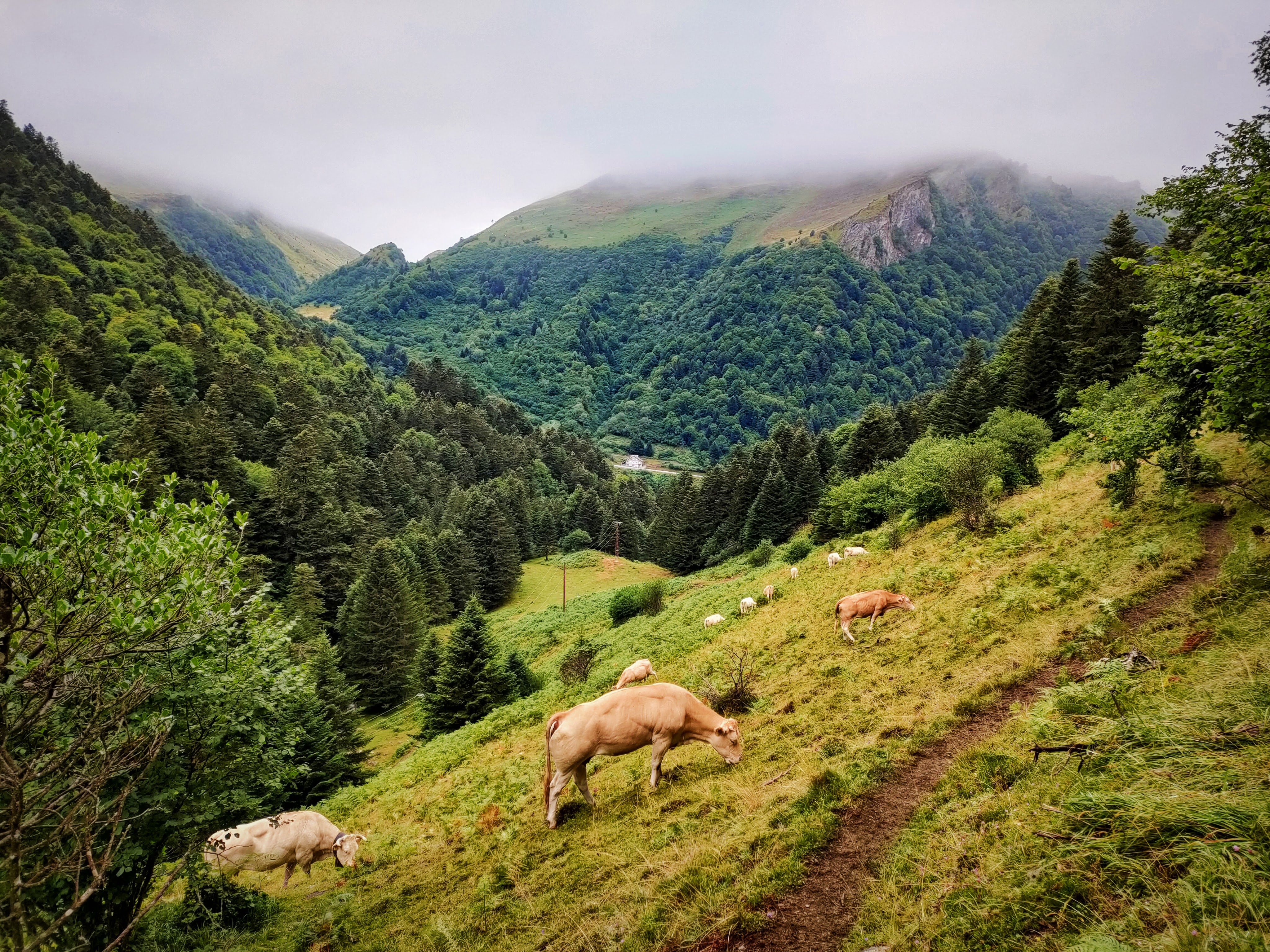 Vista la cascada, seguiremos nuestro largo camino al Pic de Bastan. El sendero sube ahora decidido por un valle espectacular, verde, verde, lleno de helechos y vacas pastando. Una pena que haya un tendido eléctrico que baja de los lagos y que atraviesa el valle como una gran cicatriz. No obstante, cuando llevemos un rato aquí, la belleza del entorno hará que los cables pasen desapercibidos…