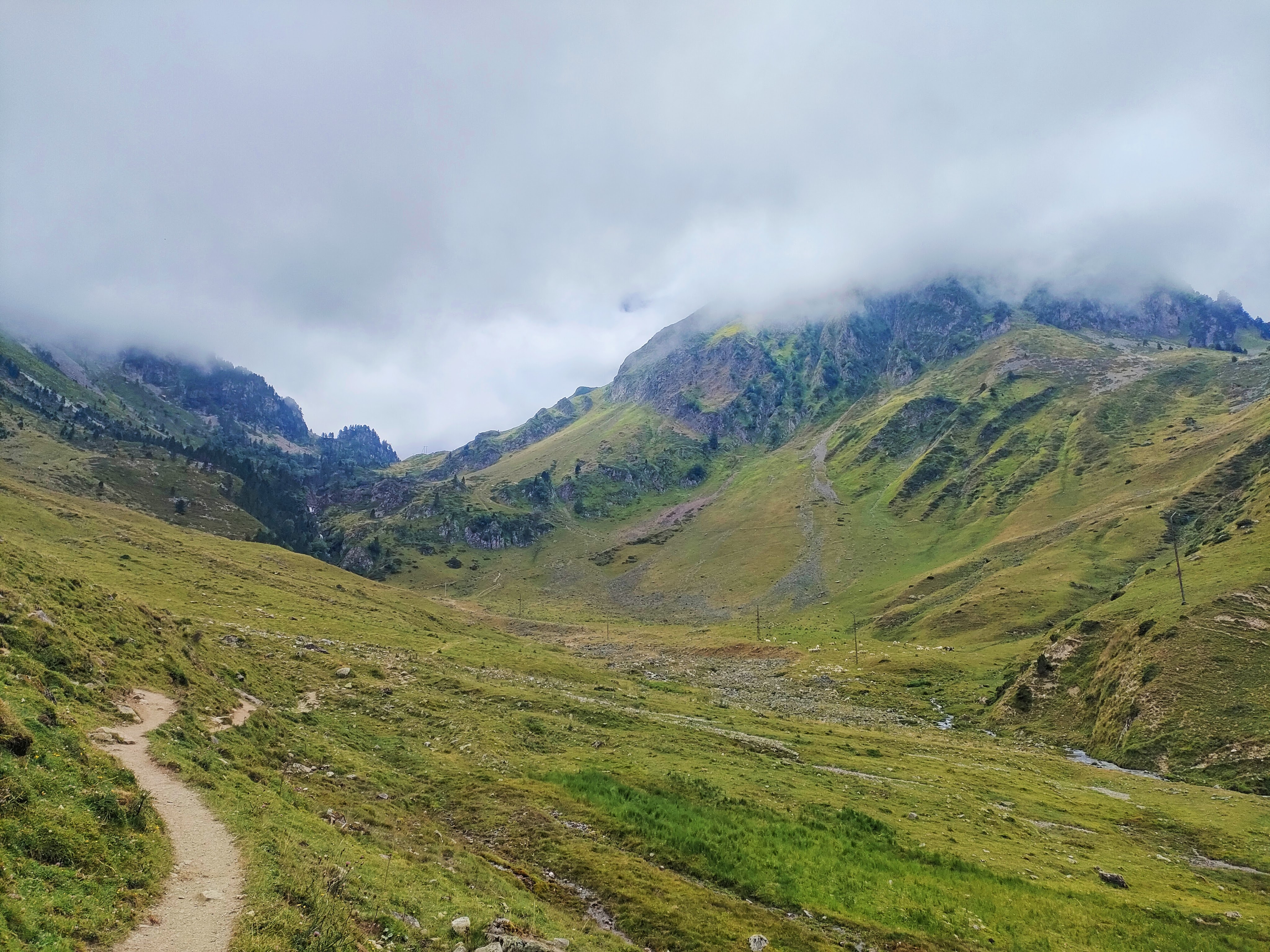 Entramos ahora dentro del mar de nubes que cubría nuestras cabezas desde el inicio de la ruta y que no abandonaremos hasta pasada la cota 2000. Una pena, pues nos perderemos las vistas de toda esta zona alta del valle aunque en la bajada sí que podremos apreciar mejor el paisaje al disipar un poco la niebla.