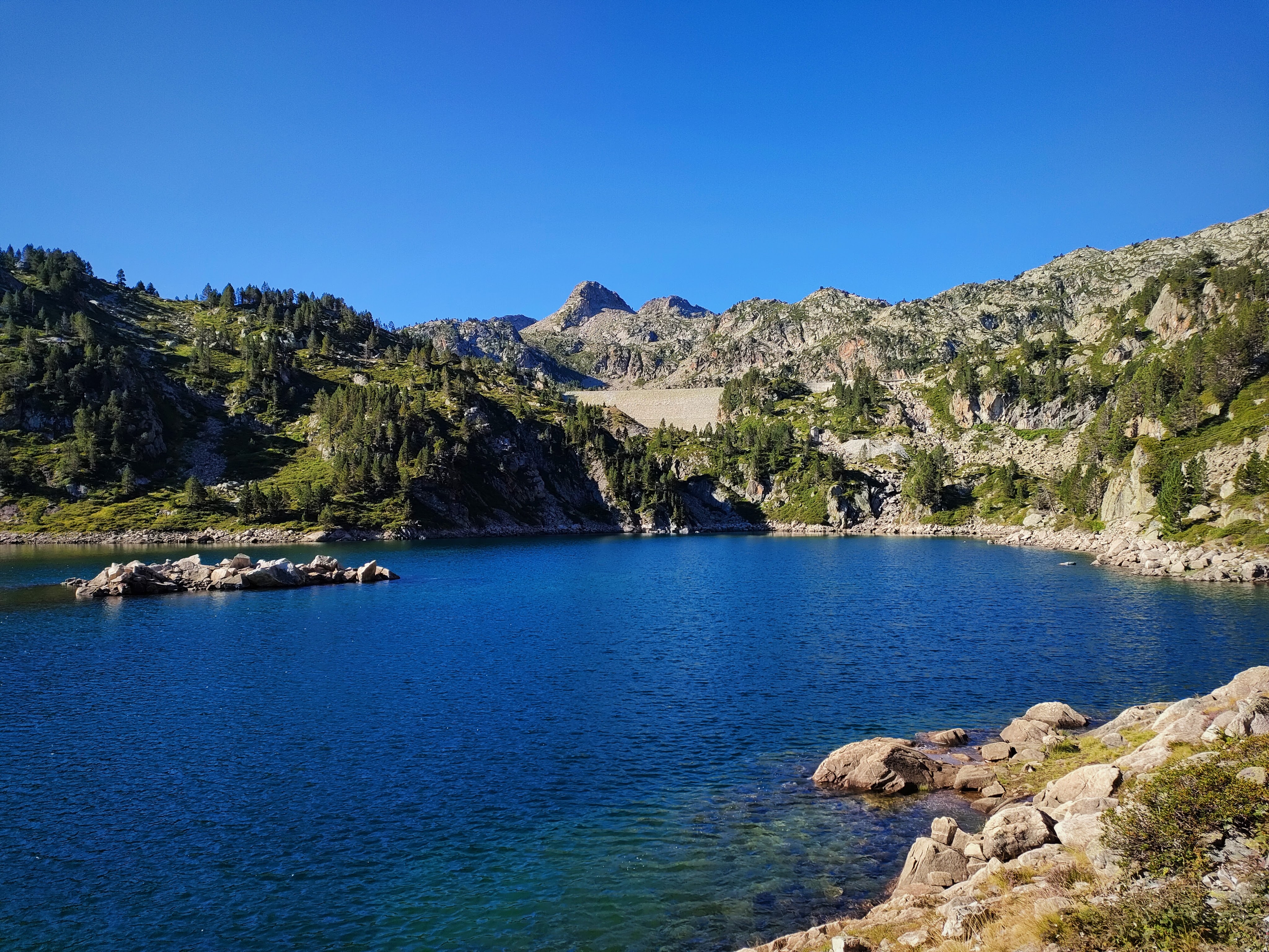 Rodearemos el lago por un camino algo más incómodo (mucha piedra) del que veníamos siguiendo hasta ahora y subiremos hacia el Lac de Gréziolles cuya presa es bien visible.