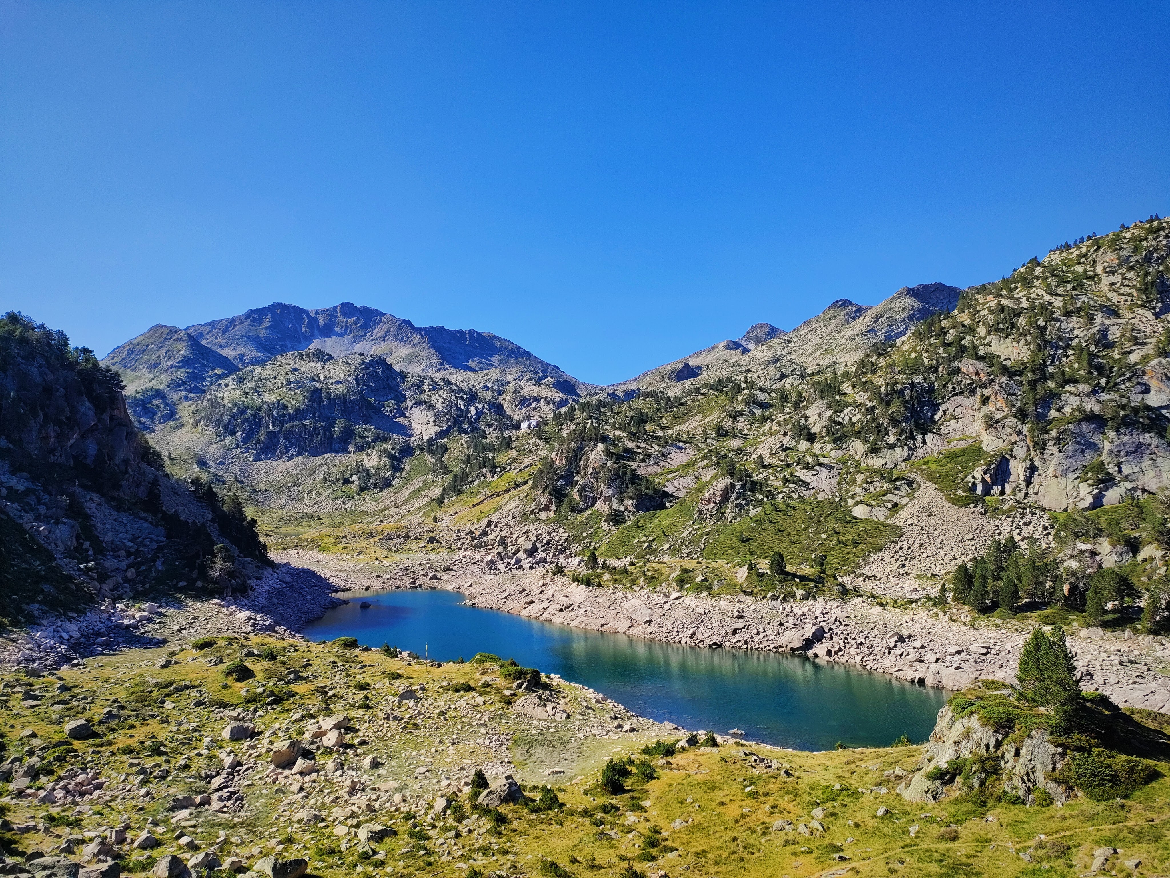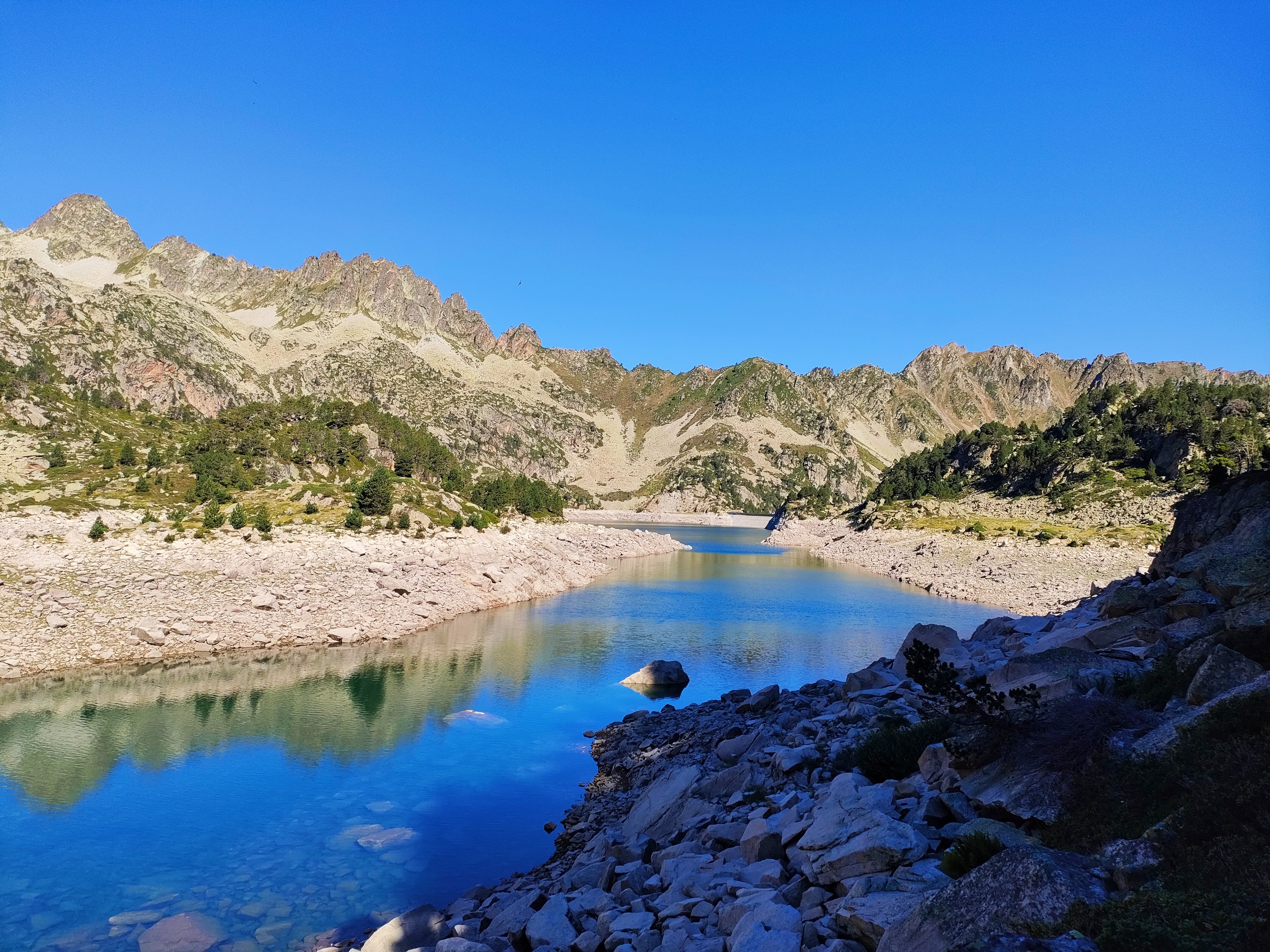 Toca ahora un tramo un poco «pestoso» con alguna bajada y subida y mucha roca. Con paciencia, alcanzaremos la cola del inmenso Lac de Gréziolles y comenzaremos a subir al ya visible refugio de la Campana de Cloutou (2.210 m).