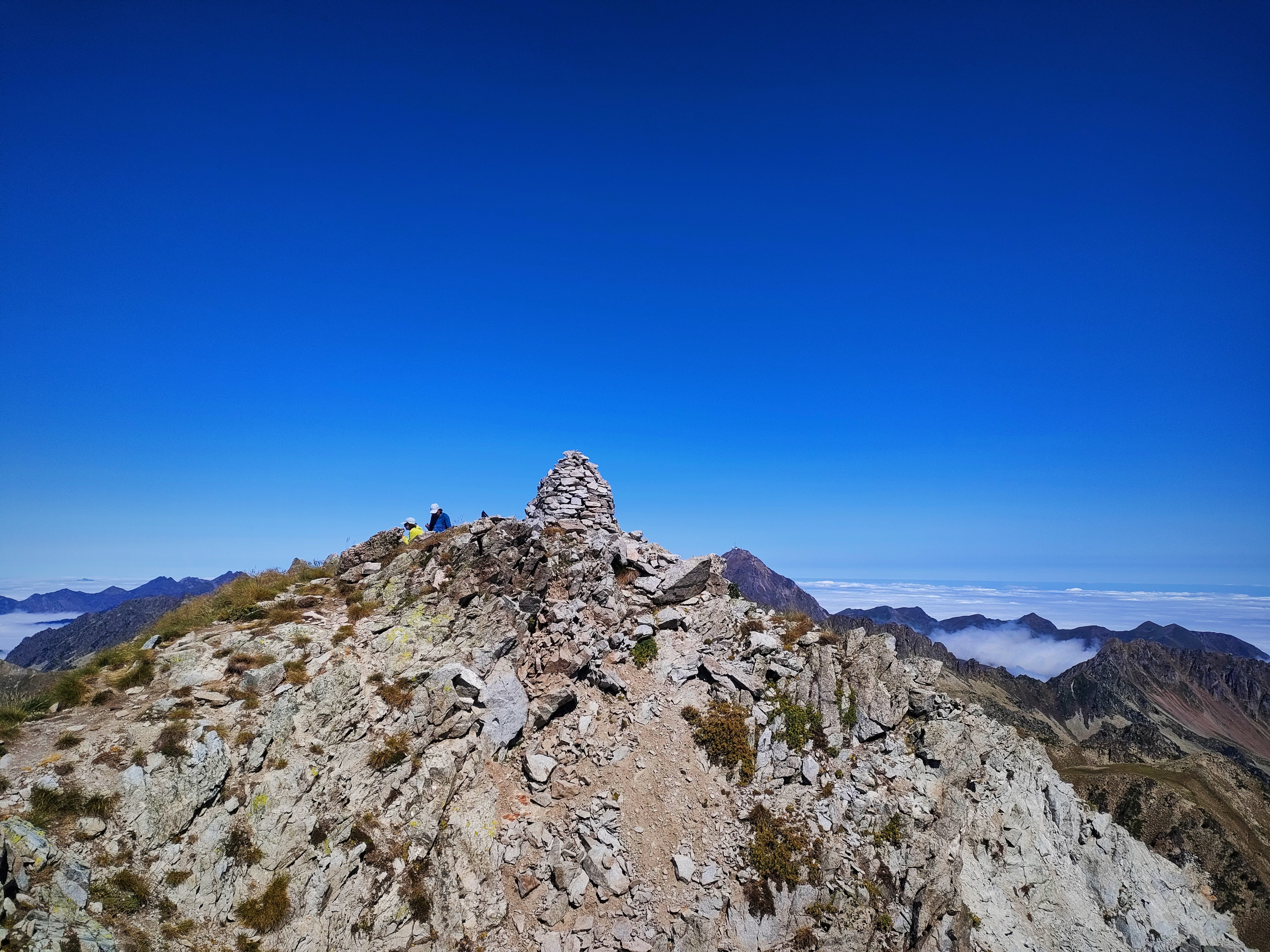 En la cima hay un gran hito y unas vistas fabulosas, especialmente del Néouvielle (3.091 m), auténtico protagonista de todo este entorno. Tras pasar un ratito arriba, comenzamos a bajar. El primer tramo con cuidado ya que voy con mi perro y su fuerte no son las trepadas ni las destrepadas. Ya después, en el sendero, sin dificultades hasta el collado. La vuelta a Artigues puede hacerse larga así que hay que tomarla con filosofía y disfrutando del paisaje y de las vistas, parando a descansar o a coger agua en alguno de los arroyos de la zona las veces que haga falta.