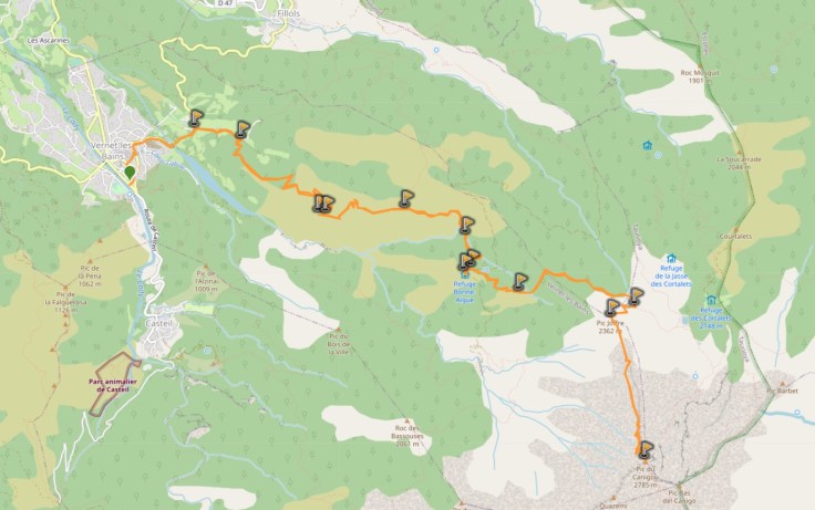 La ruta desde el pueblo francés de Vernet-les-Bains es sencilla en cuanto a lo técnico pero muy dura si nos referimos al apartado físico. La ascensión supera los 2.000 metros de desnivel positivo y el sendero que sube desde este pueblo no da tregua. Es una ascensión muy mantenida y espectacular pues veremos cómo cambia el paisaje, desde los bosques mediterráneos de las cotas bajas al terreno de alta montaña en las cotas finales.