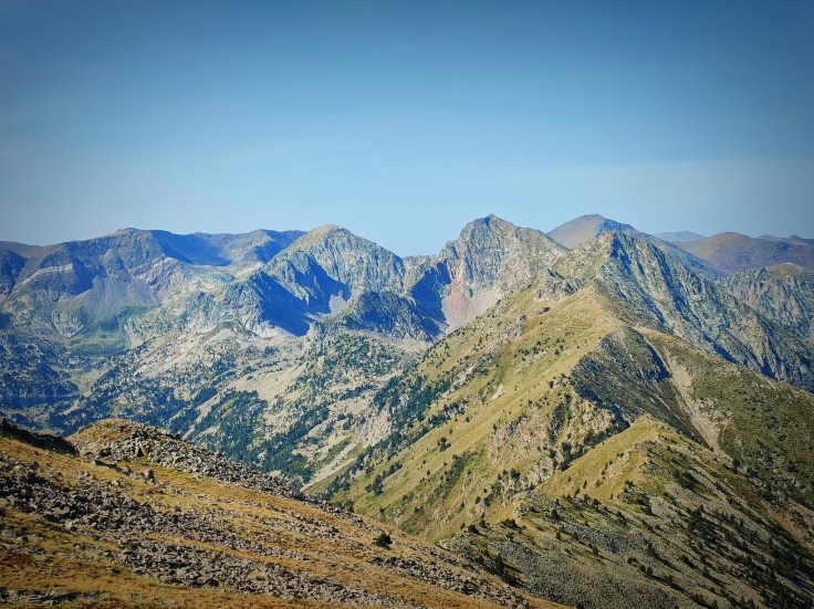Tras pasar un rato arriba identificando cimas y echando fotos, es hora de volver al Coll Mitja por el mismo camino. Desde ahí, seguiremos bajando a Els Collets d’Aval por el GR-10 sin ningún sobresalto.