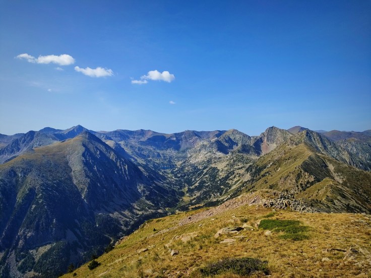 Sorprende la cabecera del valle de Carança, con su lago, y los picos fronterizos, especialmente Noufonts (2.861 m). Un poco más cerca, se aprecian los abruptos Pic del Racó Gros (2.779 m) y Pic del Racó Petit (2.785 m).