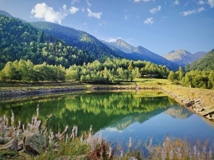 Alcanzamos la zona de Aumet y su lago. Lo recorreremos por el lateral para alcanzar una pista forestal que hay al otro lado. Esta pista conecta muy pronto con el GR-10 que viene de Planès y se dirige al refugio de Ras de Carança. Los montañeros aparecen de repente… hay bastante gente recorriendo la ruta con sus grandes mochilas.