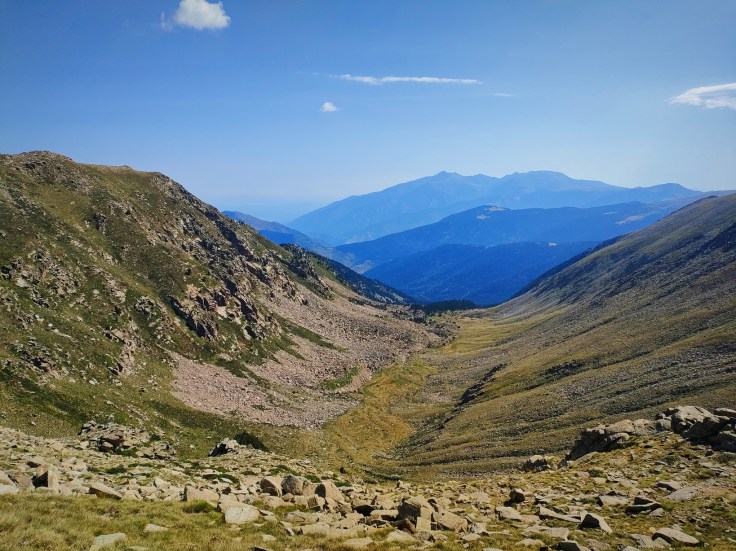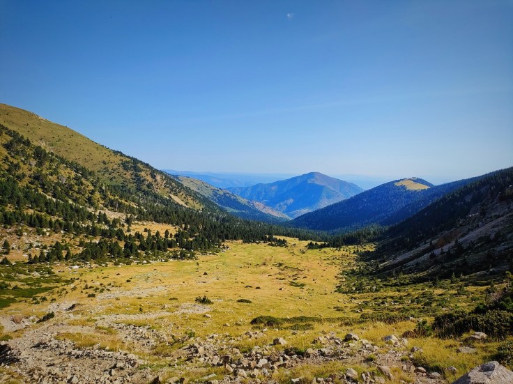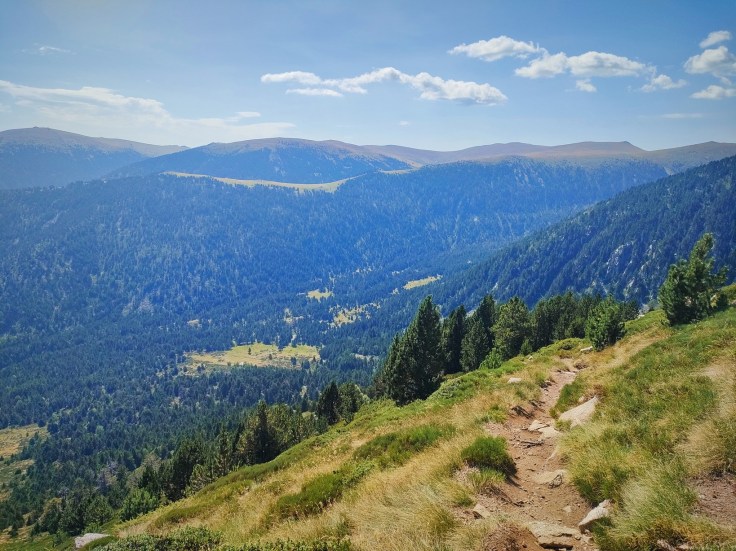 La subida al collado es cómoda, por buen sendero. Echaremos la vista atrás para apreciar el valle por donde hemos subido… Al fondo aparece un viejo conocido, el Pic de Tres Estelles (2.099 m), una montaña humilde que hemos visto en todas las excursiones que hemos hecho en la zona.