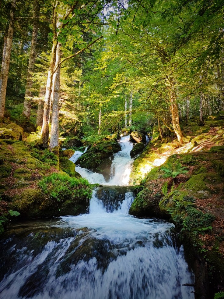 Nos metemos de lleno en un bosque espectacular por donde baja el arroyo de Lhécou conformando algunas cascadas muy vistosas. El camino, ancho y muy popular a juzgar con el número de montañeros que me crucé, sube trazando un zig-zag hasta salir a terreno despejado sobre la cota 1300.