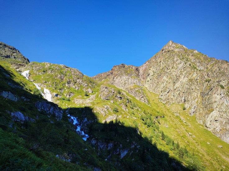 En el último tramo nos acercaremos a la generosa cascada que baja del Lac Bleu. Es un entorno muy fotogénico con las paredes de la cara Este del Bizourtère que cae a pico por esta vertiente.